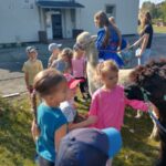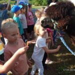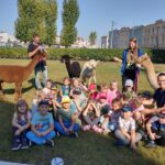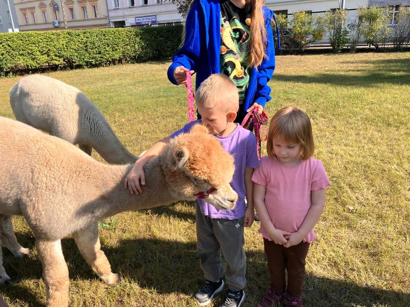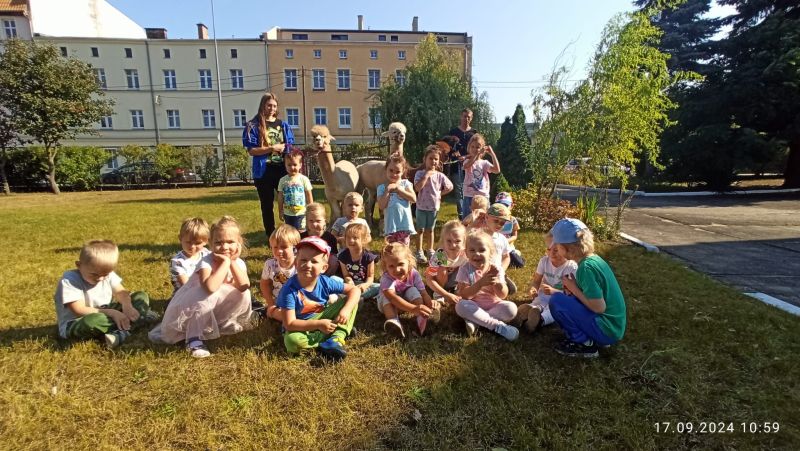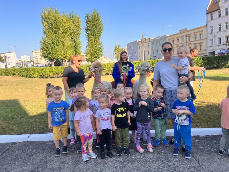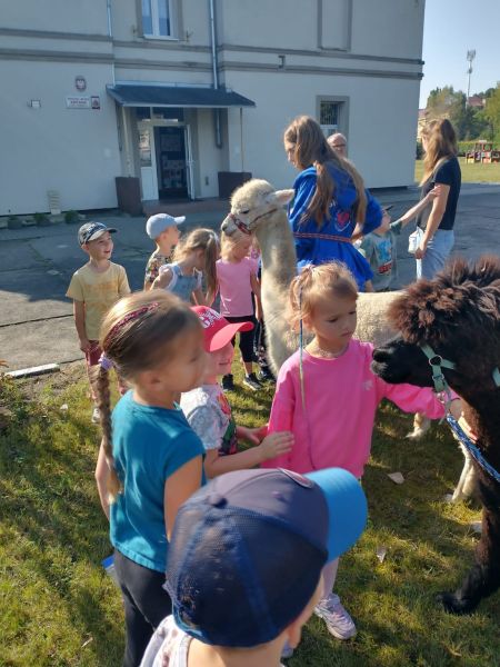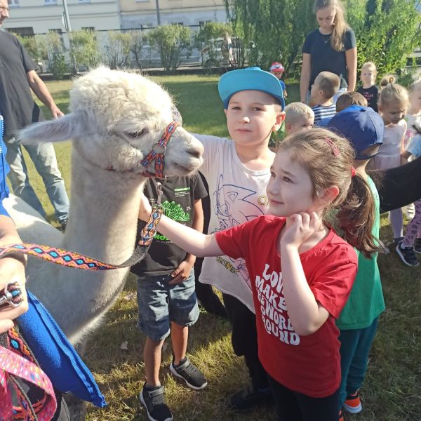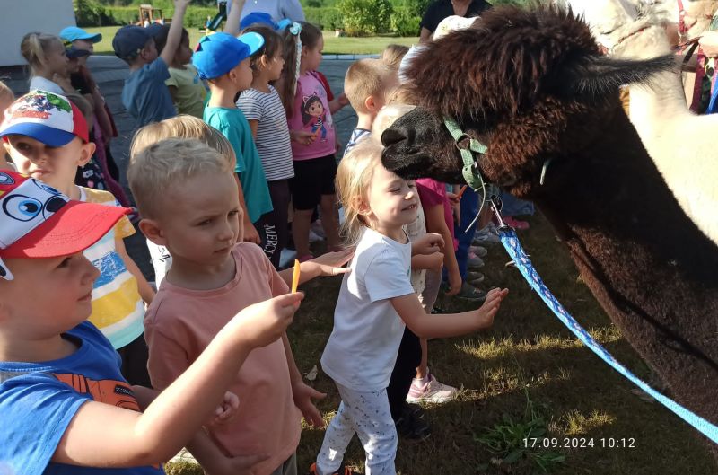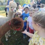 17 września w Naszym ogrodzie przedszkolnym odwiedziły nas przesympatyczne alpaki. Te niewielkie zwierzęta podobne do lamy są doskonałymi zwierzęcymi terapeutami o dużej wrażliwości i empatii. Przedszkolaki miały okazję dowiedzieć się skąd pochodzą, w jakim celu są hodowane i jak należy o nie dbać. Podczas spotkania dzieci mogły pogłaskać, przytulić i nakarmić zwierzęta. Z radością karmiły alpaki marchewkami, przytulały je a także pozowały do zdjęć.