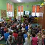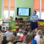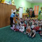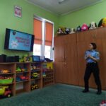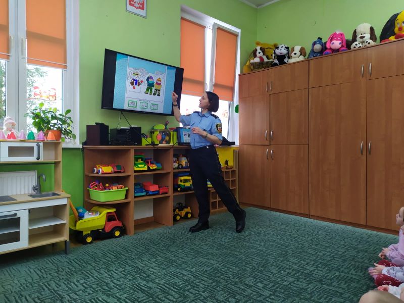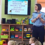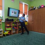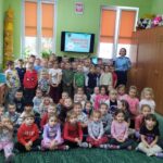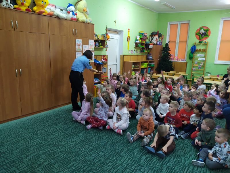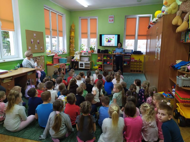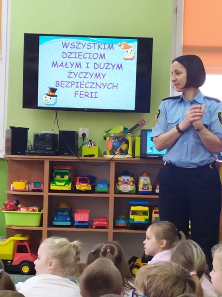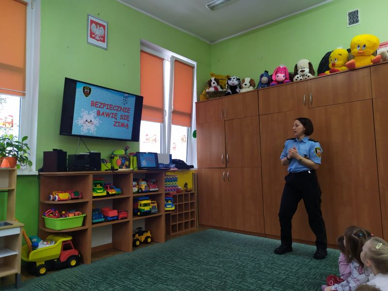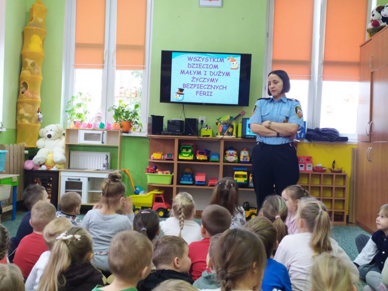 Dzisiaj dzieci wzięły udział w kolejnym spotkaniu edukacyjnym z Panią Bogusią ze Straży Miejskiej. Od razu poznaliśmy, że te Panie Bogusia już u nas była i wiedzieliśmy też, że na pewno dowiemy się czegoś o bezpieczeństwie. I nie pomyliliśmy się. Tym razem Pani Strażniczka rozmawiała z nami  na temat zasad bezpieczeństwa, jakich należy przestrzegać podczas zabaw zimowych i związanych z nimi zagrożeń. Wszystko dokładnie pokazały nam na  ekranie taką prezentację multimedialną i tablice edukacyjne. Teraz czekamy na śnieg, aby w praktyce sprawdzić poznane zasady.