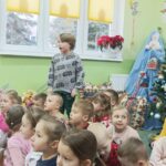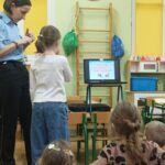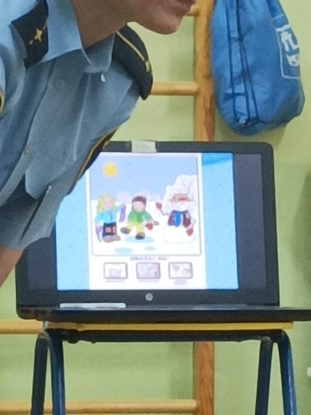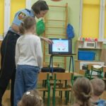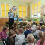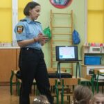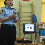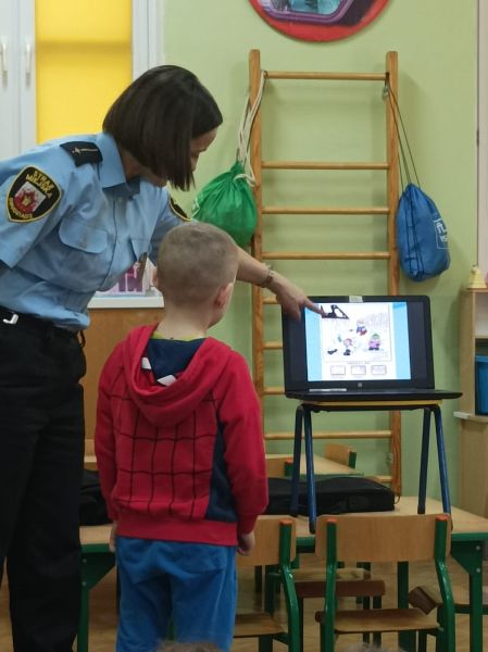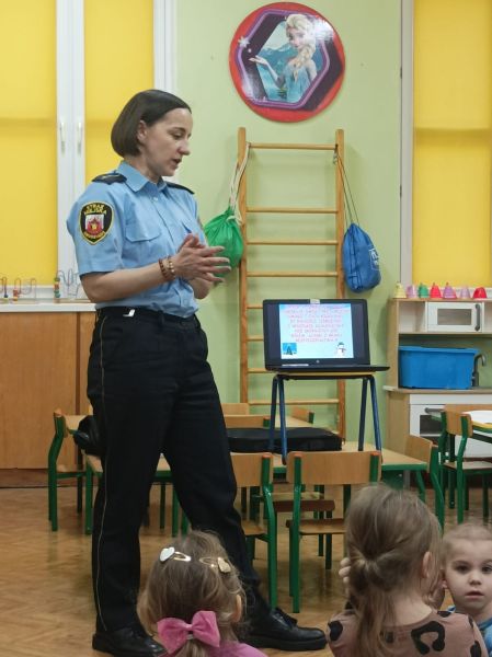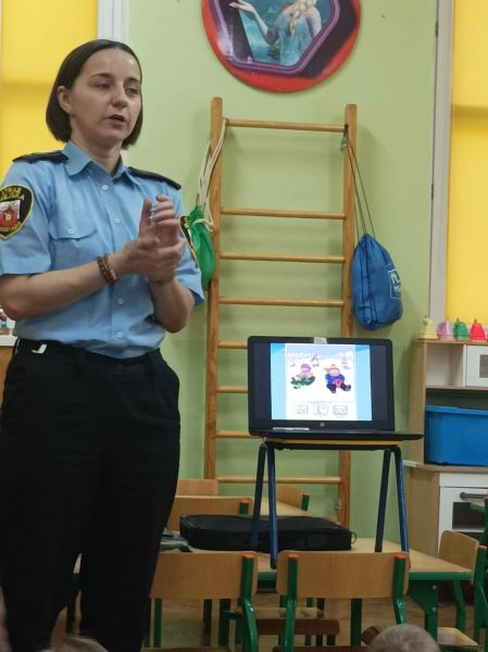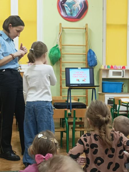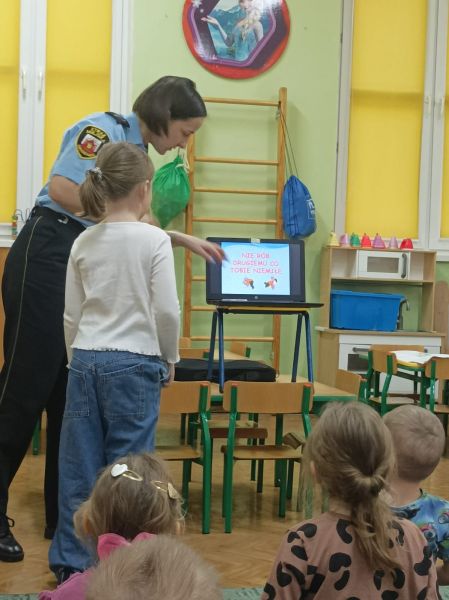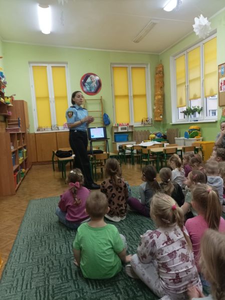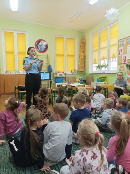 Dzisiaj po raz drugi w tym roku odwiedziła nas Pani Bogusia ze Straży Miejskiej. Od razu poznaliśmy, że ta Pani już u nas była i wiedzieliśmy też, że na pewno będzie ciekawie. I nie pomyliliśmy się. Tym razem Pani Strażniczka rozmawiała z nami na temat zasad bezpieczeństwa, jakich należy przestrzegać podczas zabaw zimowych na świeżym powietrzu i związane z nimi zagrożenia. Wszystko dokładnie pokazała nam na ekranie, taką prezentację multimedialną i tablice edukacyjne, a na zakończenie wszyscy dostali kolorowanki.