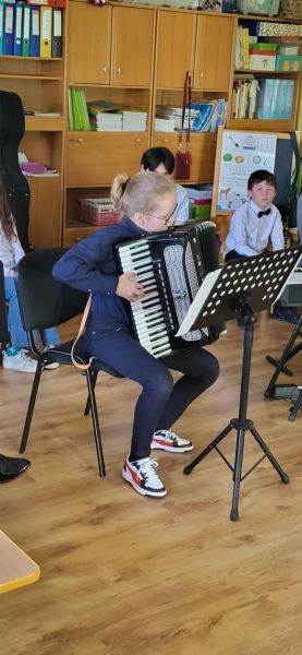 W dniu 12 maja nasze przedszkole odwiedzili wyjątkowi goście – uczniowie grudziądzkiej Szkoły Muzycznej. Wykonali piękny koncert na instrumentach, na których uczą się grać. Przedszkolaki mogły zobaczyć z bliska i zapoznać się z brzmieniem na żywo m.in. klarnetu, puzona, skrzypiec, fletu i akordeonu. Dzieci były zafascynowane instrumentami i koncertem i oczywiście wszystkie