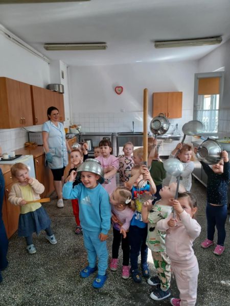 „Kurczaki” odwiedziły przedszkolną kuchnię gdzie miały możliwość zobaczenia jak przebiega proces przygotowywania posiłków. Oglądały i nazywały kuchenne naczynia i sztućce. Wiedziały jak wygląda praca pań kucharek. Dzieci były zachęcane do spożywania zdrowych posiłków.