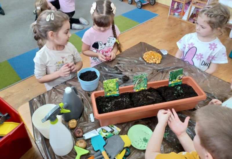 Dnia 25 marca dzieci z grupy „Zające” założyły zielony ogródek w sali przedszkolnej. Przed przystąpieniem do prac oglądały zgromadzone cebulki, nasionka i narzędzia potrzebne do prac w ogrodzie. Rozumiały, że rosliny do wzrostu potrzebują powietrza, gleby, wody i światła. Dzieci z wielkim zaangażowaniem siały koperek, sałatę, szczypiorek, rzodkiewkę i pietruszkę. Z niecierpliwością czekamy…