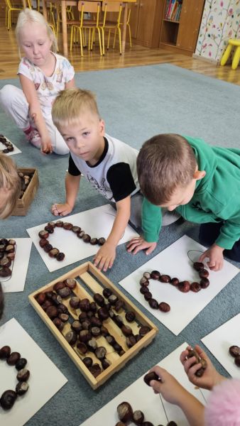 Dzieci z grupy „Krasnali „ nie próżnują…..tylko jesienią na kasztanach rachują….. Zajęcia matematyczne ze skarbami jesieni to świetna okazja by pobawić się liczeniem….