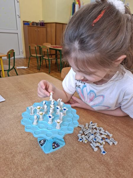 Gra zręcznościowa. ,,Kosmonauci” grupa  Jeżyki dzieci ćwiczyły koncentrację i precyzję, okazywały swoje emocje podczas gry. Jeżyki, także brały udział w grze pt.: „Był sobie kosmos”. Przedszkolaki z wielkim zaangażowaniem odpowiadały na pytania dotyczące kosmosu i układali na ciekawej planszy specjalne pionki. Było to świetnie połączenie zabawy i nauki!