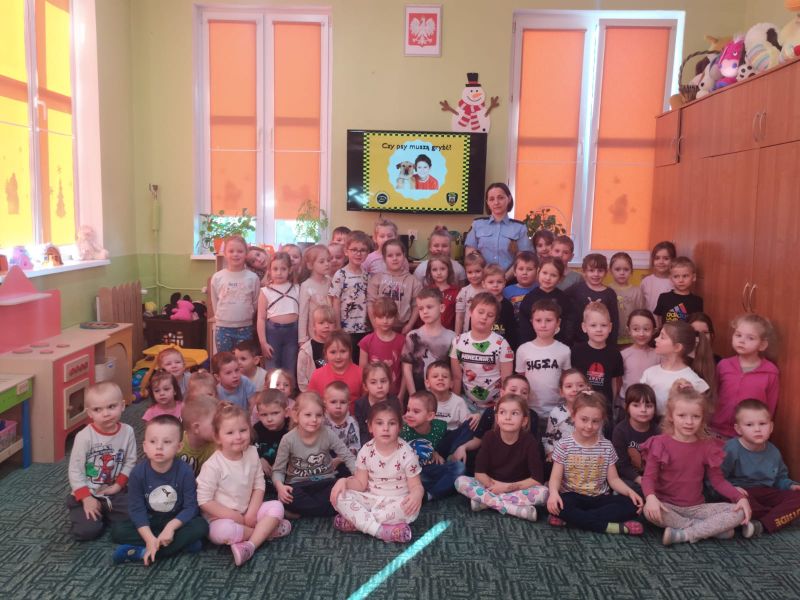 Jakie zasady bezpieczeństwa obowiązują podczas kontaktu z psem dowiedzieliśmy się po spotkaniu z panią Bogusią naszą znajomą funkcjonariuszką Straży Miejskiej. Podczas zajęć  poprzez zabawę  poznaliśmy mowę ciała psa oraz najważniejsze sygnały za pomocą, których pies komunikuje się z ludźmi, gdy jest przyjaźnie nastawiony lub gdy jest zły. Ważnym komunikatem była informacja, że niestety nie wszystkie