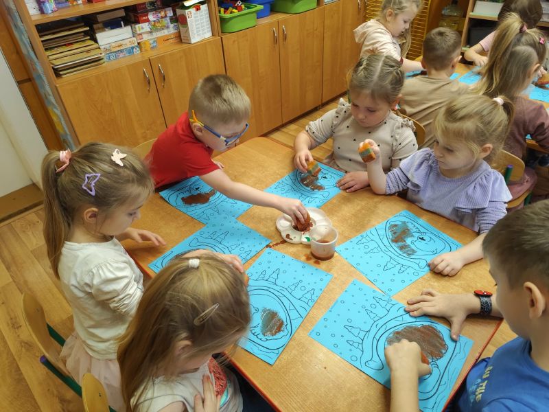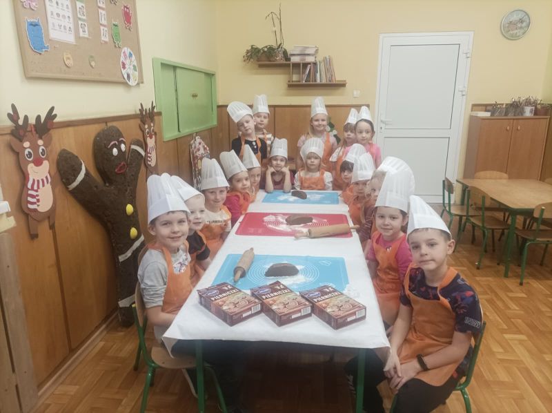 Dzisiaj po umyciu rąk i ubraniu fartuszka poszliśmy do przygotowanego stolika aby wykonać pierniki. Pani przygotowała ciasto, a my mogliśmy je wynieść, rozwałkować i wycisnąć kształt za pomocą foremki. Udało się nawet odrobinę posmakować ciasta. Pierniki układała pani na blachę i gotowe do upieczenia.
