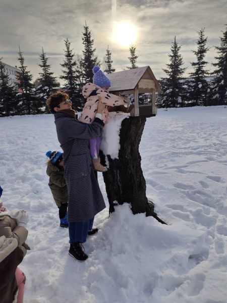 Przedszkolaki wiedzą, że jak spadnie śnieg to ptakom trudniej znaleźć pożywienie. Wiedzą również, że ptaki należy nakarmić nasionami, a nie chlebem. Dzisiaj w przedszkolnym karmniku było ucztowanie😊