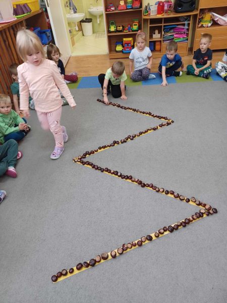 Zabawy z kasztanami w grupie „Zajaców”. Jesienne zabawy z użyciem kasztanów sprawiły wiele radości przedszkolakom. Dzieci wykonywały ciekawe aktywności takie jak układanie z kasztanów różnych kształtów, przenoszenie ich za pomocą szczypców. Przedszkolaki wykonywały także ślimaczka z plasteliny, który otrzymał kasztanowa skorupkę.
