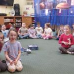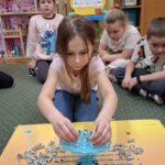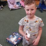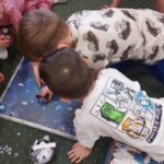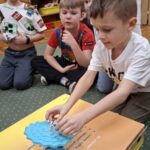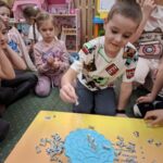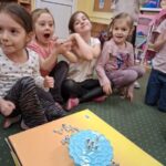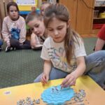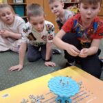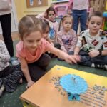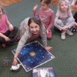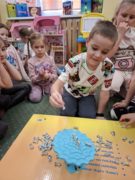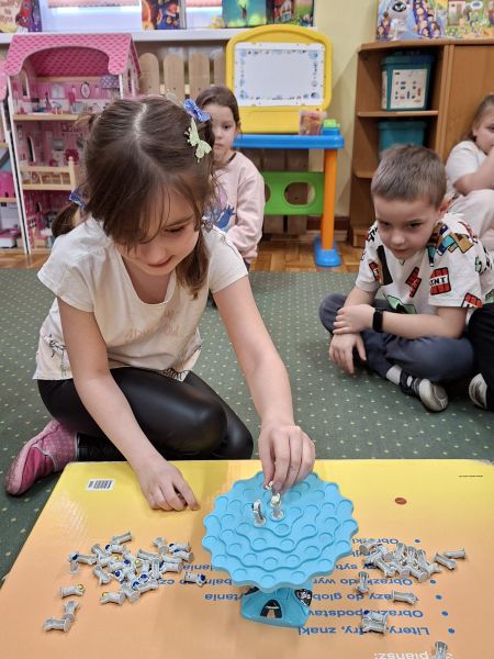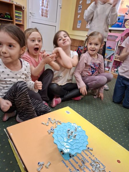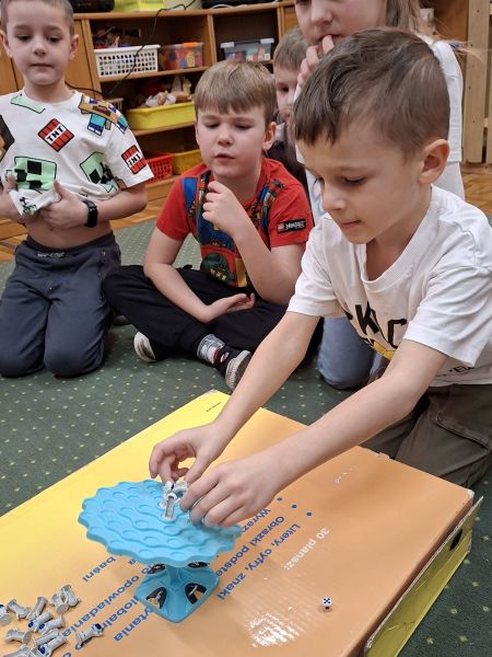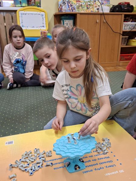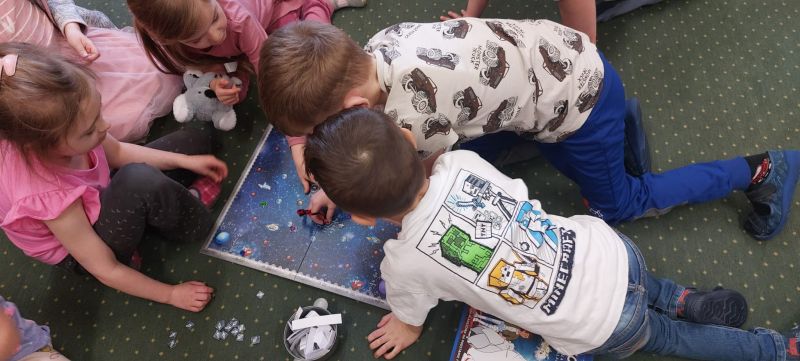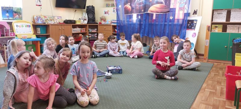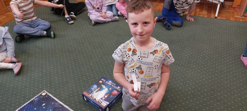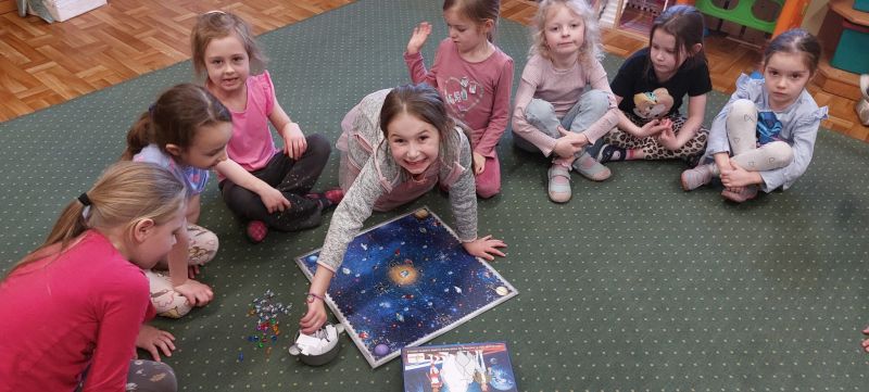 Jeżyki, także brały udział w grze pt.: „Był sobie kosmos”. Przedszkolaki z wielkim zaangażowaniem odpowiadały na pytania dotyczące kosmosu i układali na ciekawej planszy specjalne pionki. Było to świetnie połączenie zabawy i nauki!