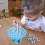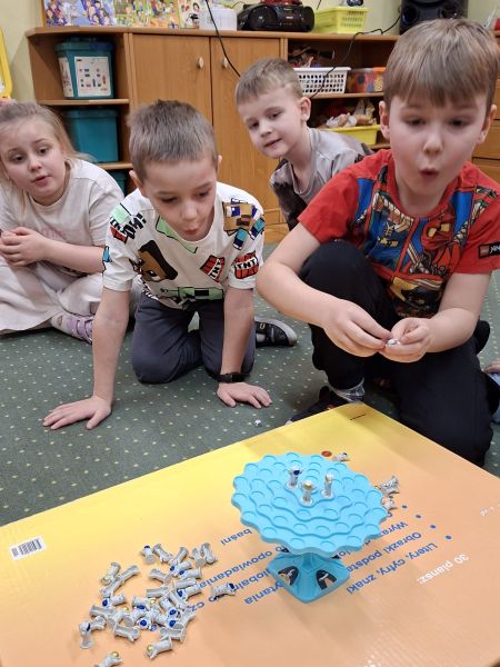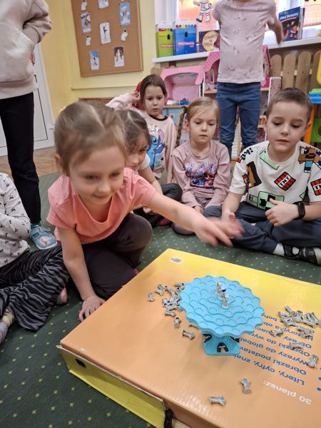 Gra zręcznościowa. ,,Kosmonauci” grupa Jeżyki dzieci ćwiczyły koncentrację i precyzję, okazywały swoje emocje podczas gry.