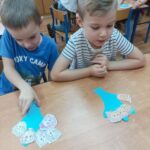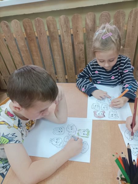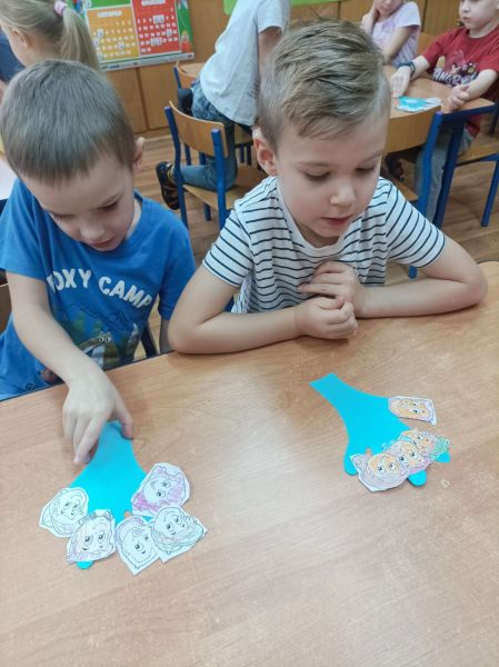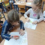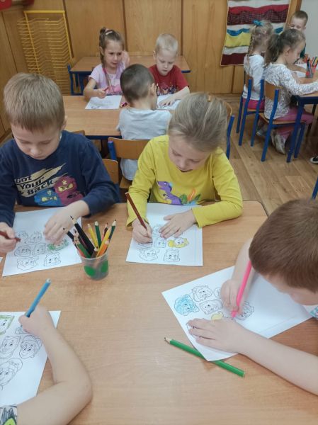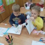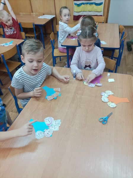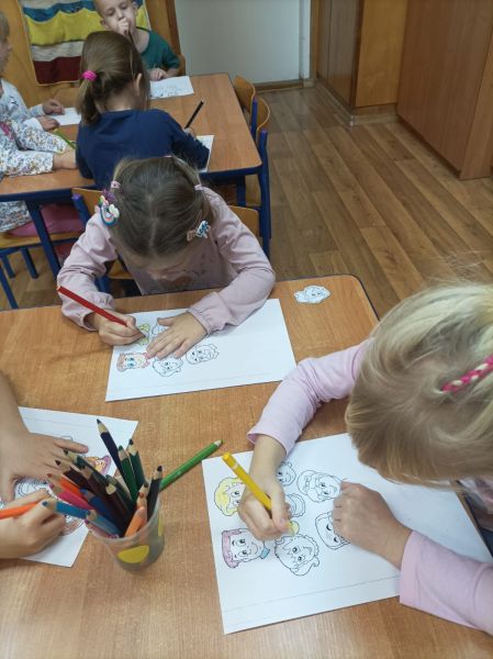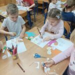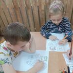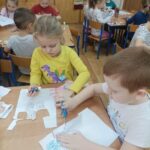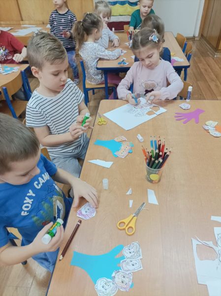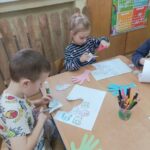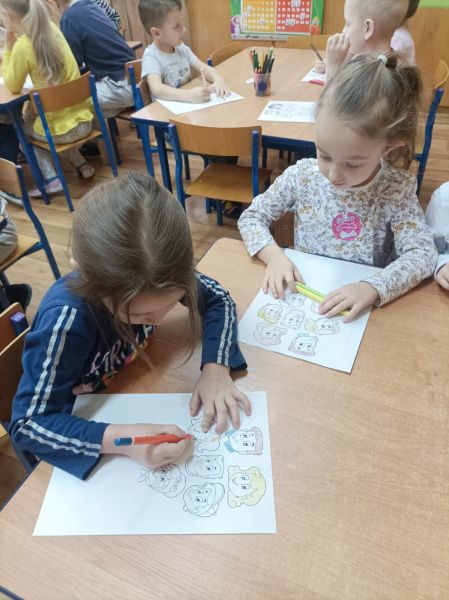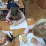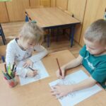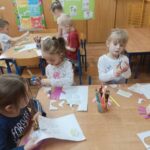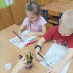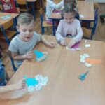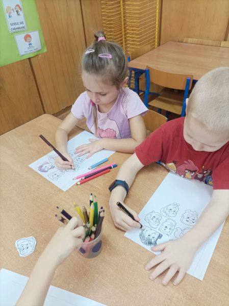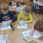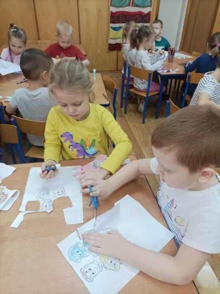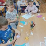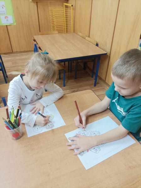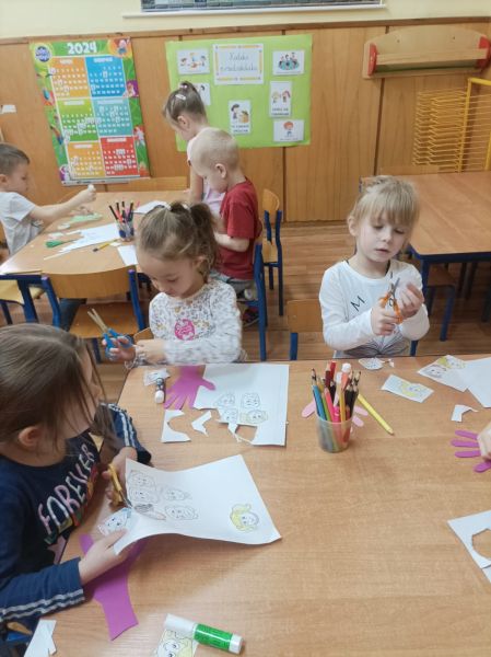 Dzisiaj wykonamy pracę plastyczną. Posłuchaliśmy piosenki o rodzinie i pani omówiła kolejne etapy wykonania pracy. Każdy z nas wymienił swoich domowników i zaczęliśmy pracę. Najpierw kolorowane zostały wybrane postacie, potem zostały wycięte nożyczkami i przyklejone do