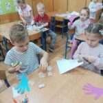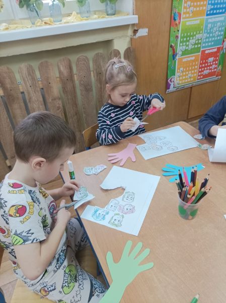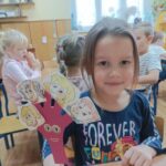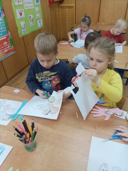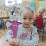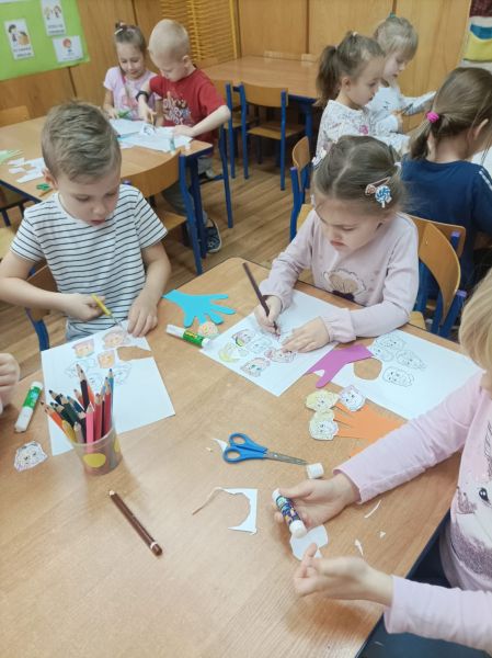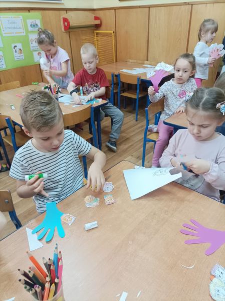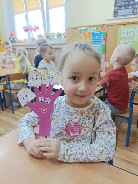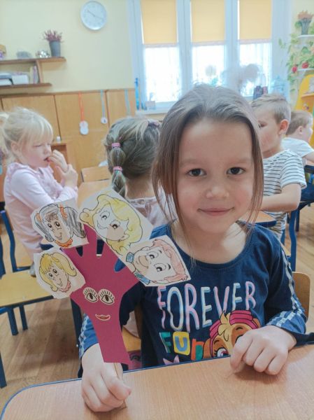 kolorowej dłoni . Każdy z nas wybierał gotowe elementy – kształt oczu i ust. Pani Kasia tylko przykleiła patyczek i rączka gotowa.