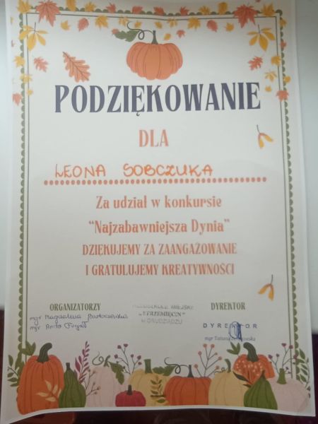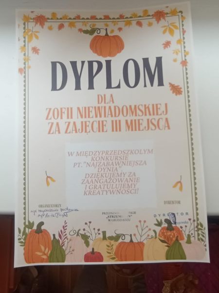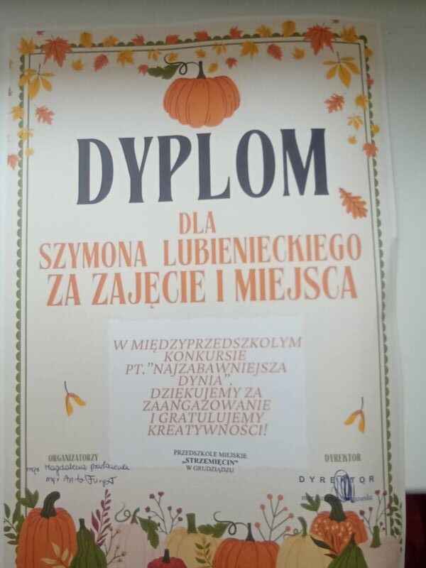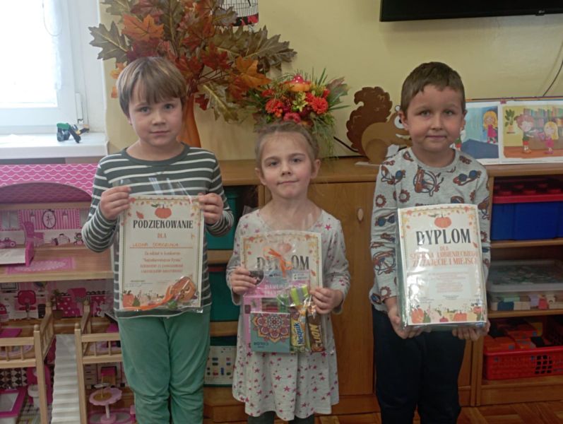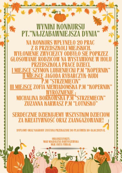 Międzyprzedszkolny konkurs pt. „Najzabawniejsza dynia” 4 listopada 2024 Dzieci z naszego przedszkola z grupy Kreciki i Jeżyki wzięły udział w Międzyprzedszkolnym Konkursie na Najzabawniejszą dynię. Poniżej wyniki konkursu.