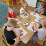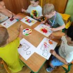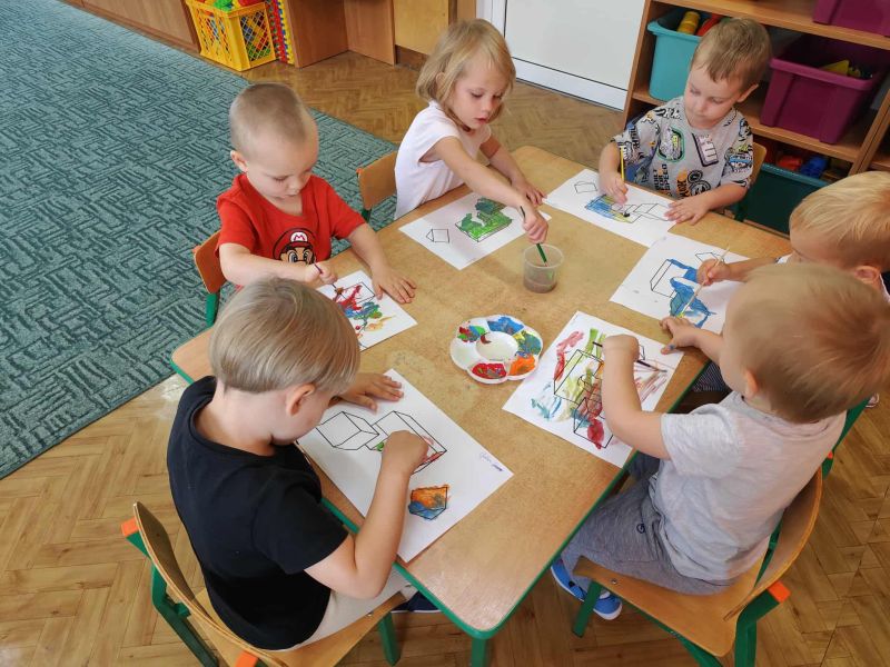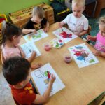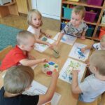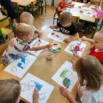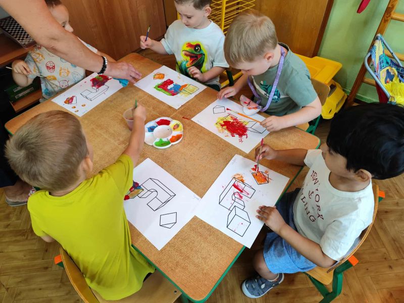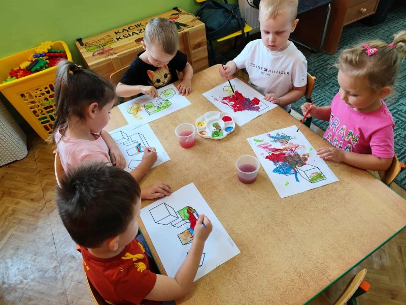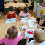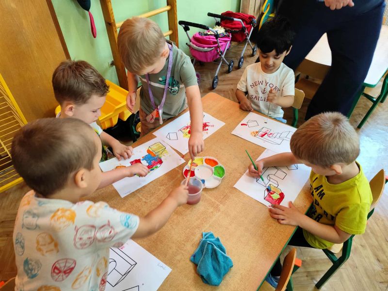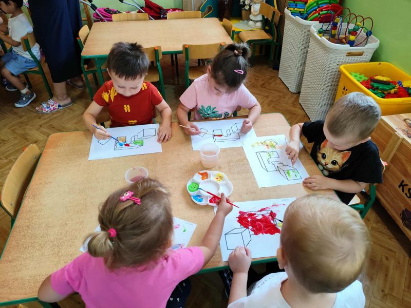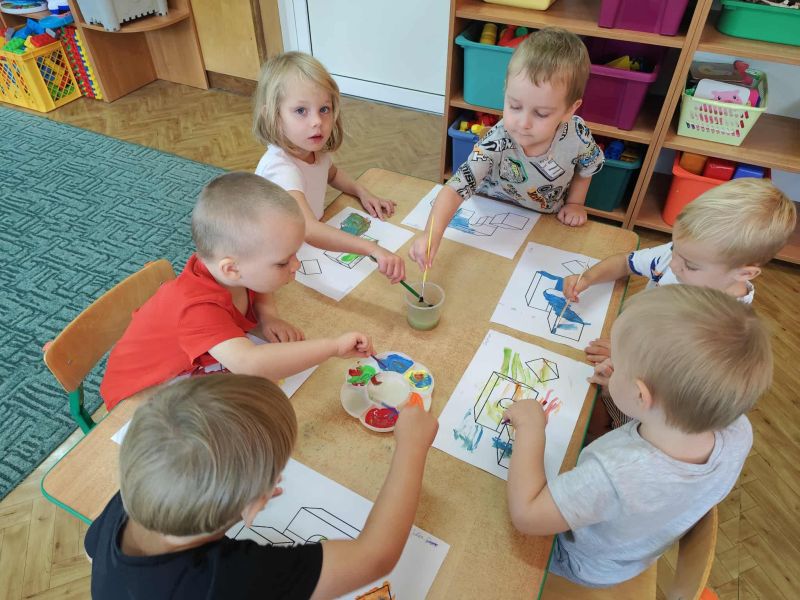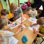 Myszki dziś pierwszy raz malowały farbami. Malowanie farbami, to nie tylko forma rozrywki, ale również sposób na rozwijanie kreatywności, koncentracji, a nawet redukcję stresu. Działa terapeutycznie, pomaga wyrażać emocje, wspiera rozwój motoryki małej i koordynację oko-ręka. Malowanie pozwala na swobodne eksperymentowanie z kolorami, kształtami i technikami, co stymuluje wyobraźnię i kreatywne myślenie. I właśnie pierwsze próby Myszki mają za sobą.