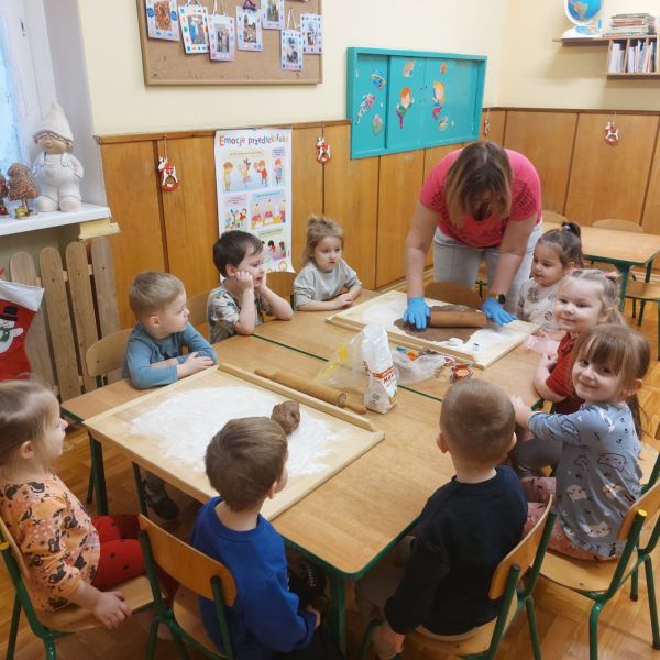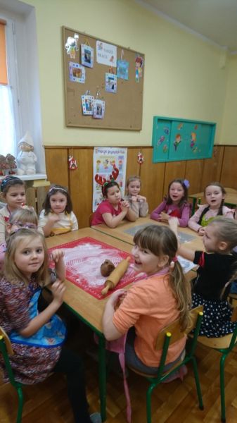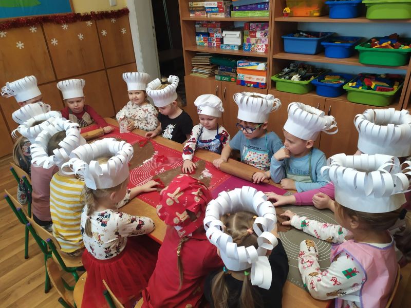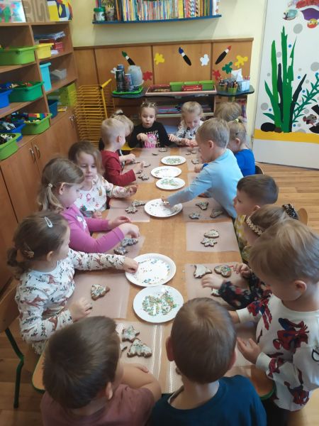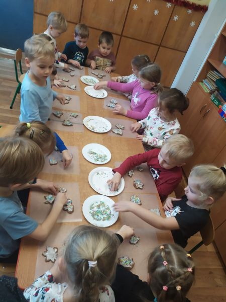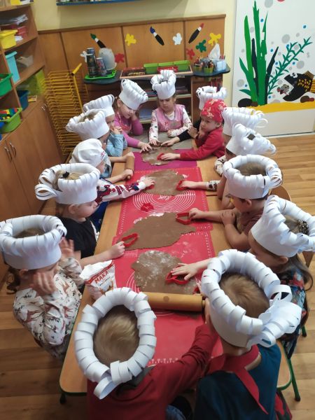 W drugim tygodniu grudnia dzieci z naszego przedszkola zgodnie z przedświąteczną tradycją upiekły pyszne świąteczne pierniczki. Najpierw odpowiednio się przygotowały dbając o czyste  rączki oraz zakładając fartuszki. Z pomocą pań praca z przygotowaniem wypieków szła sprawnie i bez trudu. Przedszkolaki w każdej grupie mieszały składniki, wygniatały i wałkowały ciasto według przygotowanych wcześniej przepisów. Wszystkim podobało się wykrawanie świątecznych kształtów – choinek, gwiazdek, bałwanków, aniołków, przy pomocy foremek. Następnie słodkie ciasteczka piekły się w przedszkolnej kuchni. Po przedszkolu zaczął unosić się wspaniały zapach pieczonych pierniczków, który wprawił wszystkich w świąteczny nastrój. Gdy pierniczki były już gotowe dzieci przystąpiły do ich dekorowania  lukowymi pisakami i barwnymi posypkami. Zabawa była doskonała a pierniczki wyszły przepiękne.