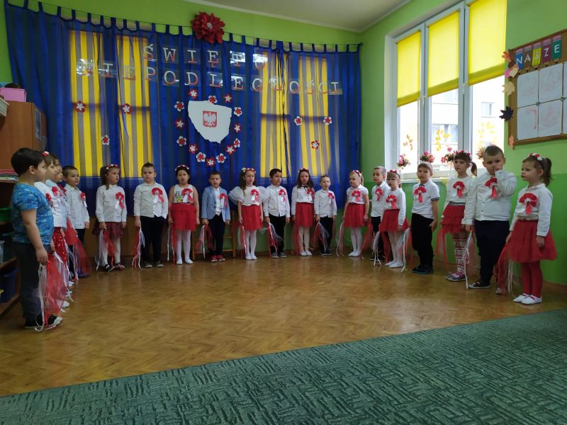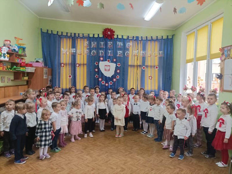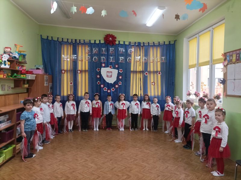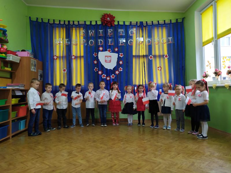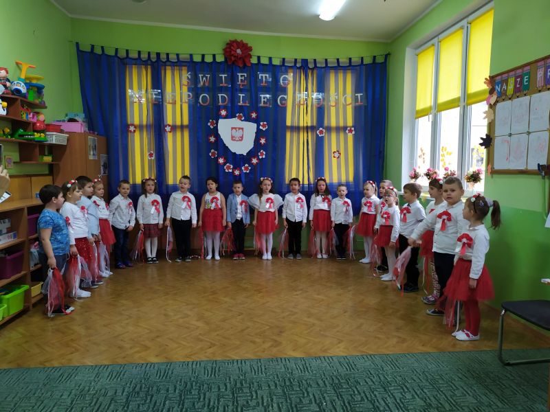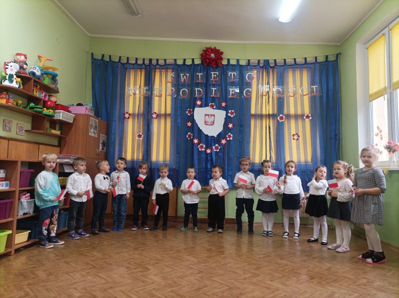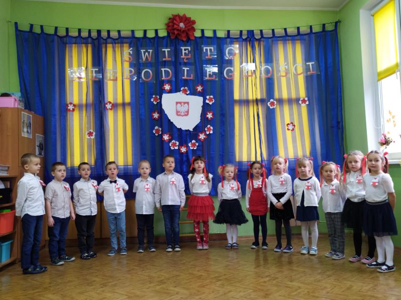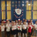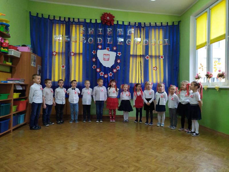 Aby uczcić ten ważny dzień   odśpiewaliśmy hymn państwowy z powagą na twarzach i przyjmując oczywiście prawidłową postawę. Wszyscy wiemy  jak cenne jest to, co mamy obecnie, to że teraz my – Polacy możemy używać swojej flagi i godła, śpiewać swój hymn, mówić w ojczystym języku.  Wszystkie dzieci pod kierunkiem swoich pań przygotowały i  zaprezentowały montaż słowno-muzyczny, który został odebrany przez publiczność entuzjastycznie.  Dzień Niepodległości stał się bardzo radosnym dniem w naszym przedszkolu i mamy nadzieję, że zapadnie on w pamięci naszych „Małych Polaków”. Ciekawa scenografia przypominająca, iż wszyscy jesteśmy Polakami, flagi i odświętne stroje, to wszystko stworzyło niecodzienną atmosferę spotkania.