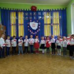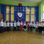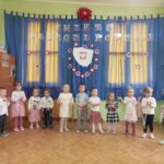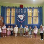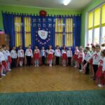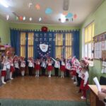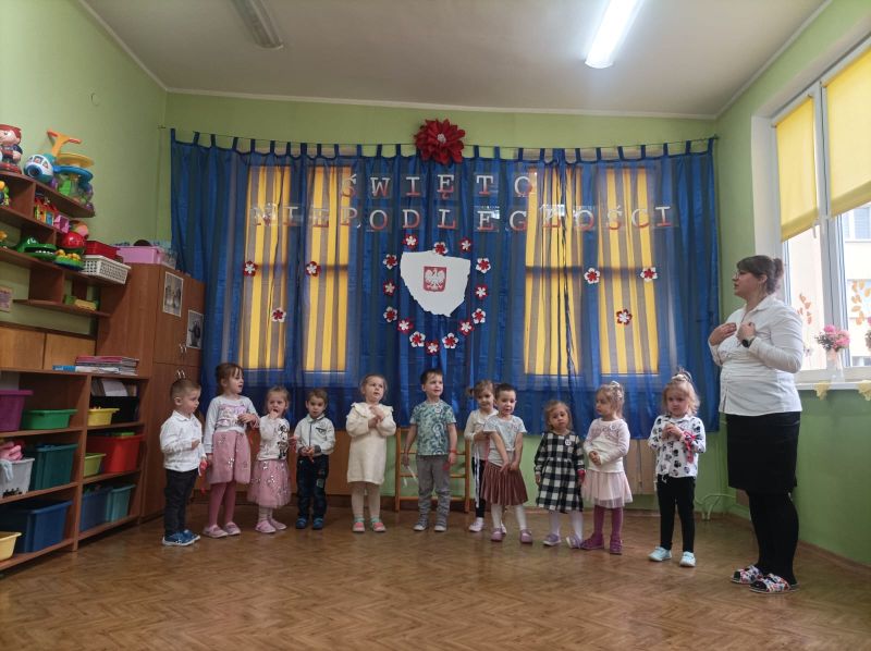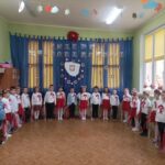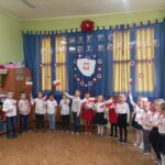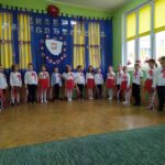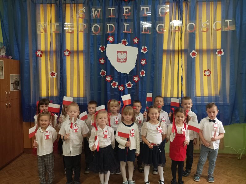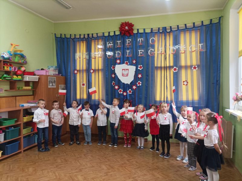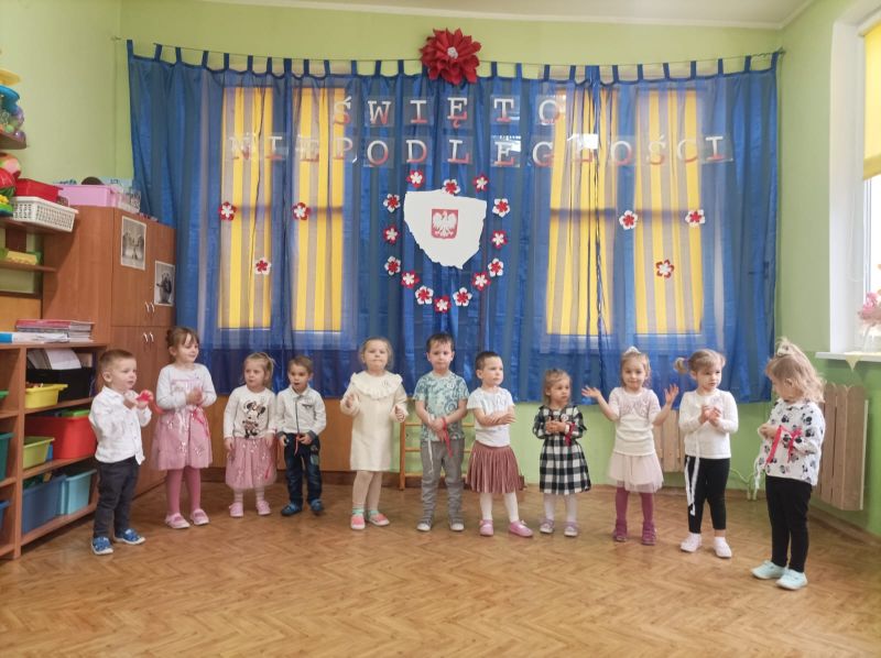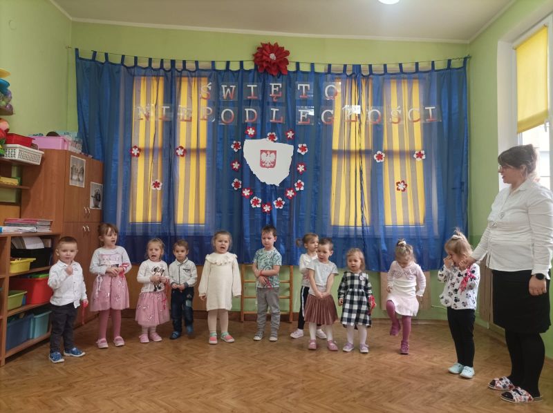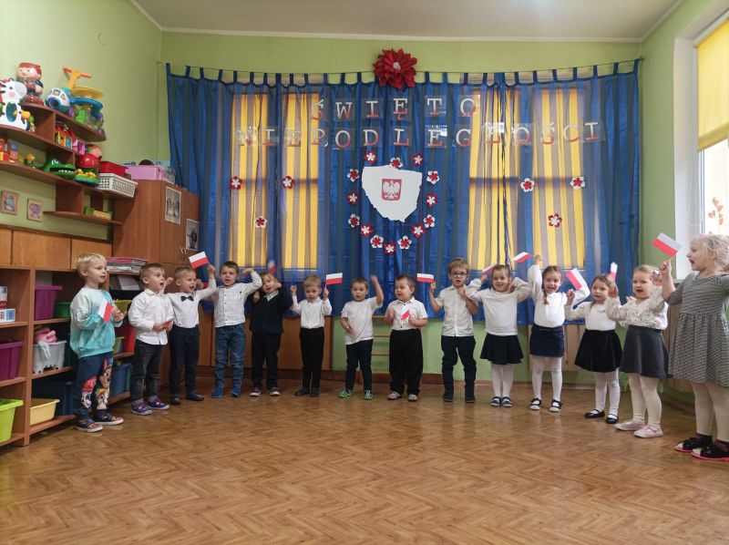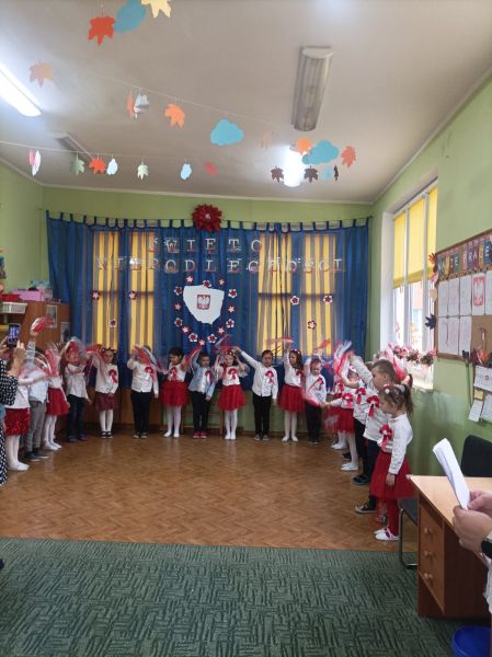 Aby uczcić ten ważny dzień   odśpiewaliśmy hymn państwowy z powagą na twarzach i przyjmując oczywiście prawidłową postawę. Wszyscy wiemy  jak cenne jest to, co mamy obecnie, to że teraz my – Polacy możemy używać swojej flagi i godła, śpiewać swój hymn, mówić w ojczystym języku.  Wszystkie dzieci pod kierunkiem swoich pań przygotowały i  zaprezentowały montaż słowno-muzyczny, który został odebrany przez publiczność entuzjastycznie.  Dzień Niepodległości stał się bardzo radosnym dniem w naszym przedszkolu i mamy nadzieję, że zapadnie on w pamięci naszych „Małych Polaków”. Ciekawa scenografia przypominająca, iż wszyscy jesteśmy Polakami, flagi i odświętne stroje, to wszystko stworzyło niecodzienną atmosferę spotkania.