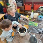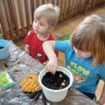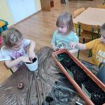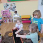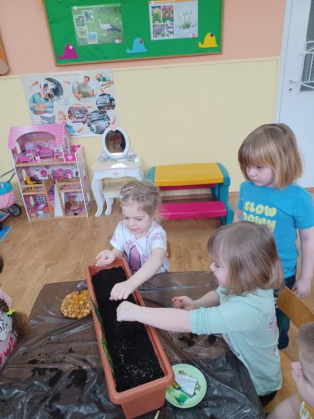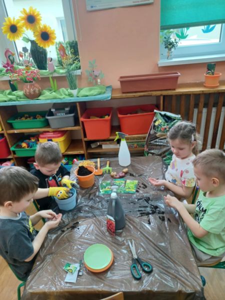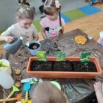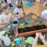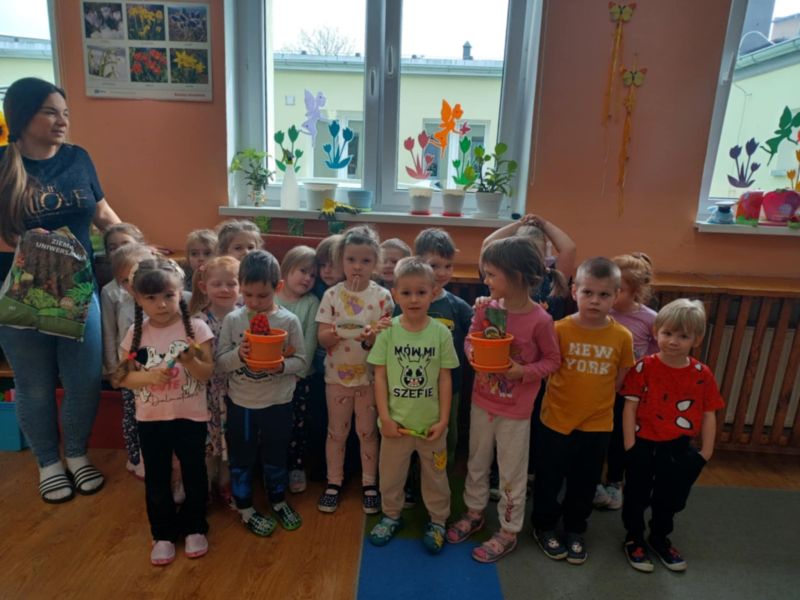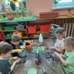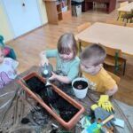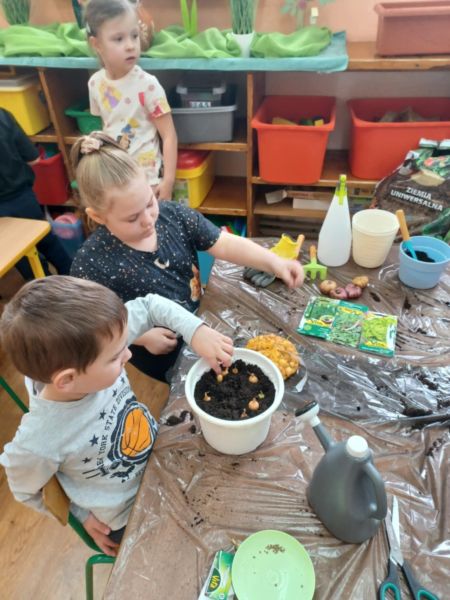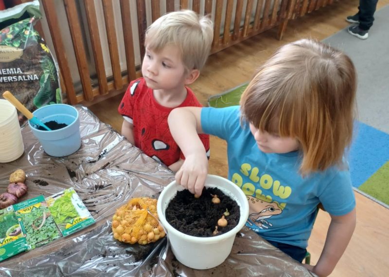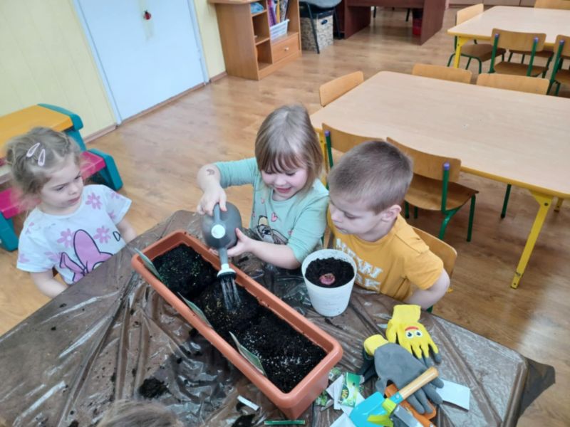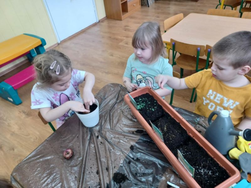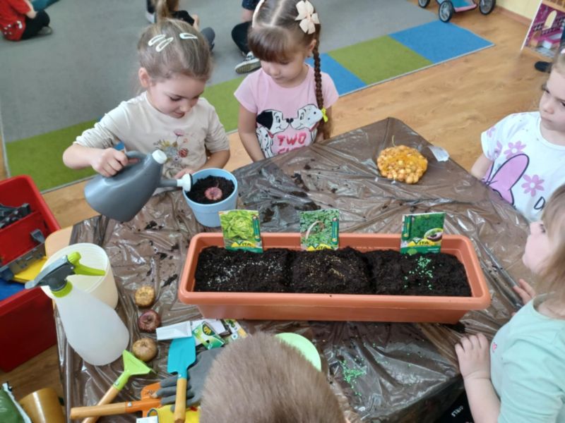 Dnia 25 marca dzieci z grupy „Zające” założyły zielony ogródek w sali przedszkolnej. Przed przystąpieniem do prac oglądały zgromadzone cebulki, nasionka i narzędzia potrzebne do prac w ogrodzie. Rozumiały, że rosliny do wzrostu potrzebują powietrza, gleby, wody i światła. Dzieci z wielkim zaangażowaniem siały koperek, sałatę, szczypiorek, rzodkiewkę i pietruszkę. Z niecierpliwością czekamy na nasze plony.