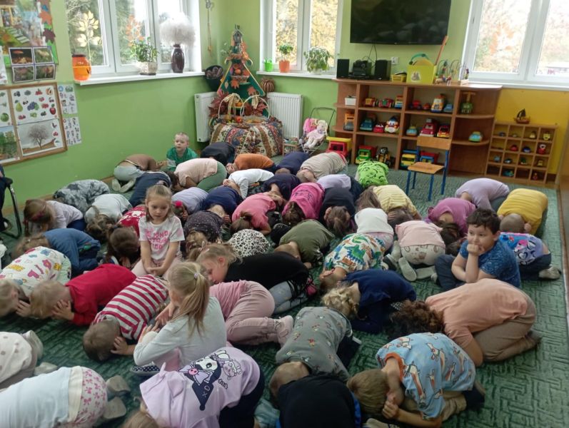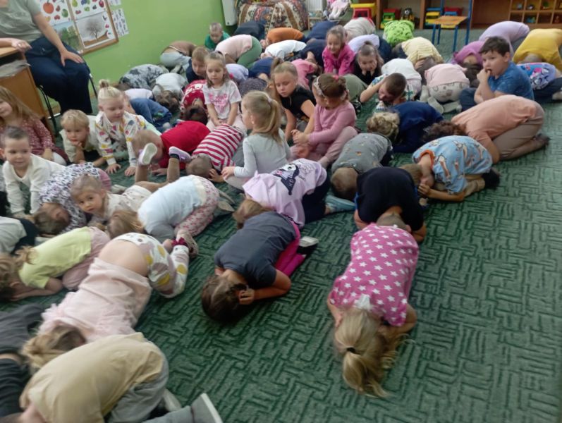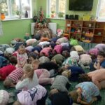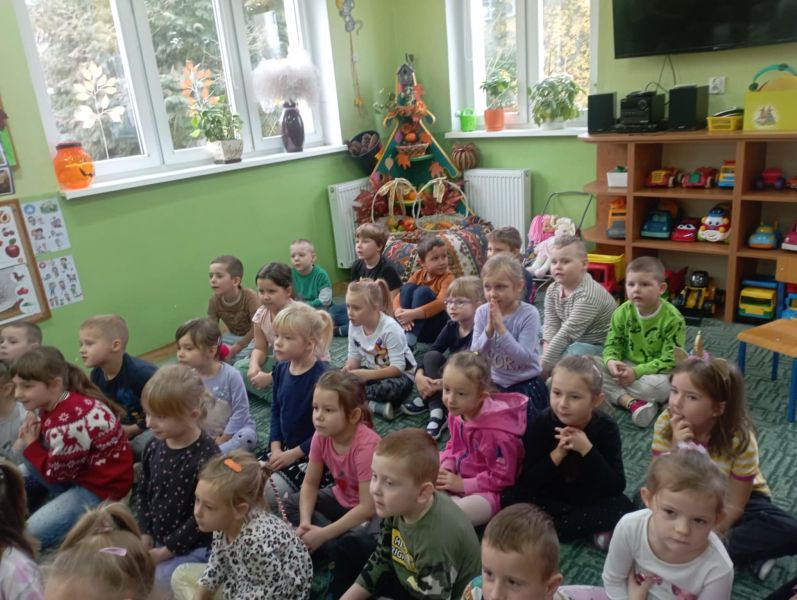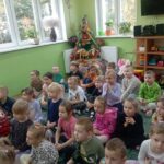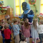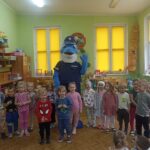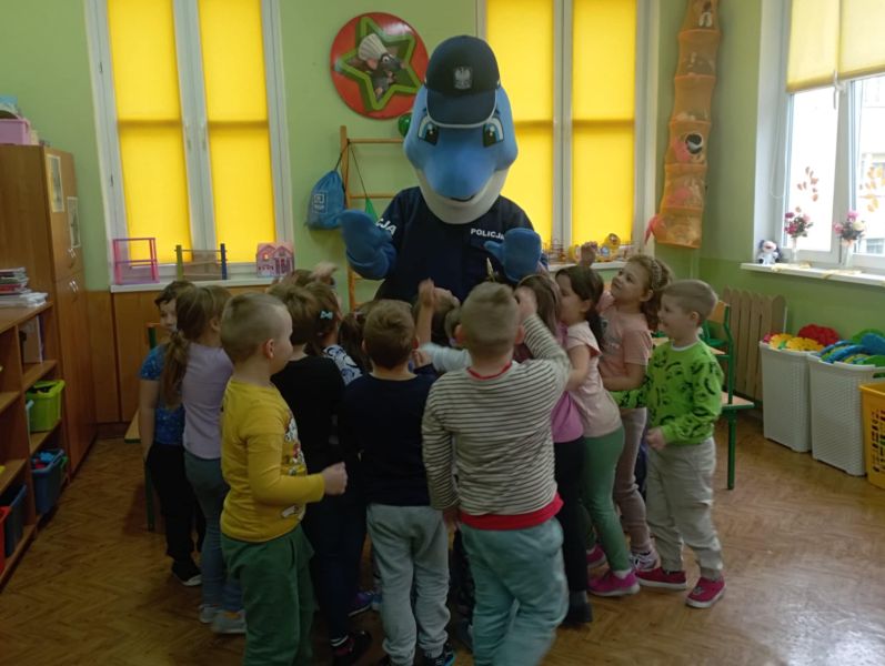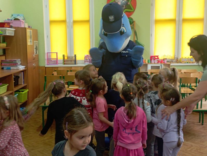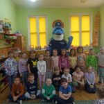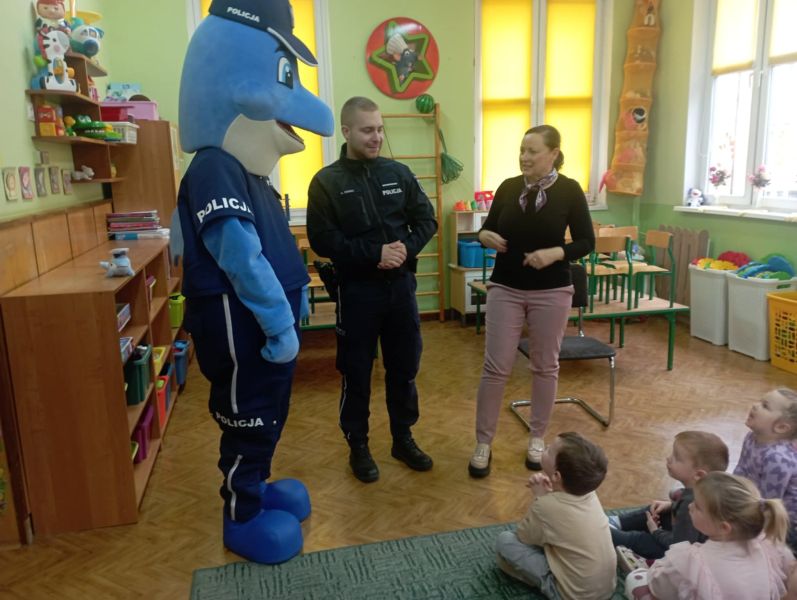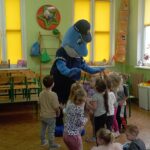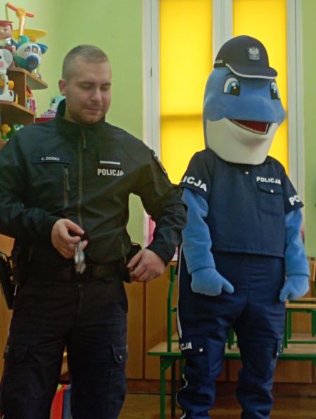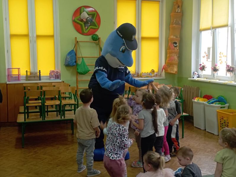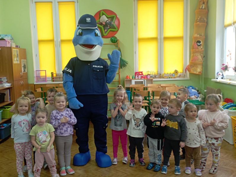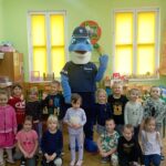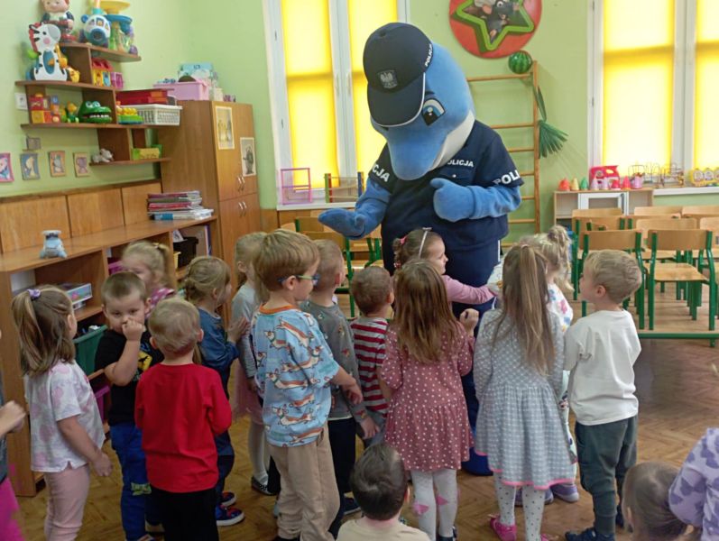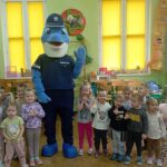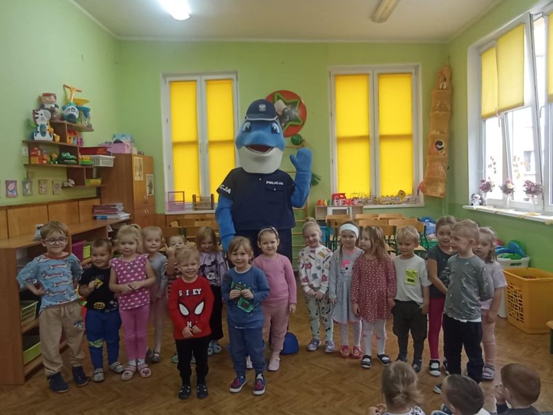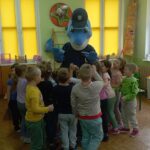 Dnia 29 października gościliśmy w naszym przedszkolu Pana Policjanta i Polfinka. W spotkaniu uczestniczyły wszystkie dzieci. Tematem było bezpieczeństwo wokół nas. Pan policjant podczas rozmowy poruszał temat bezpieczeństwa w domu (np. otwieranie drzwi nieznajomym), na placu zabaw (np. oddalanie się z miejsca wyznaczonego do zabawy) oraz bezpieczeństwa na drodze i chodniku (np. przechodzenie przez ulicę, poruszanie się po chodniku). Na zakończenie spotkania dzieci przytuliły się do Polfinka i wykonały wspólne pamiątkowe zdjęcia