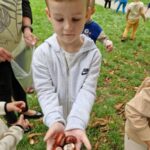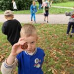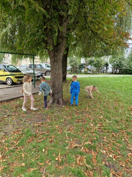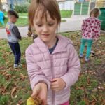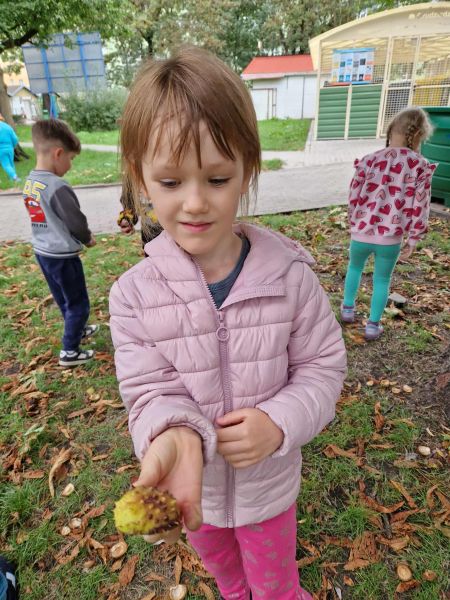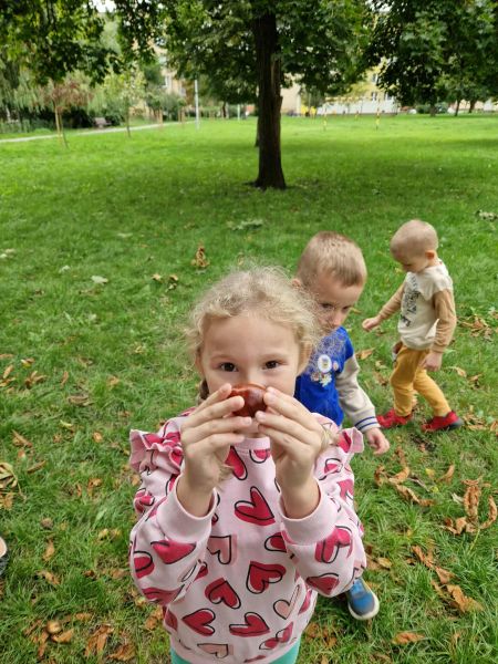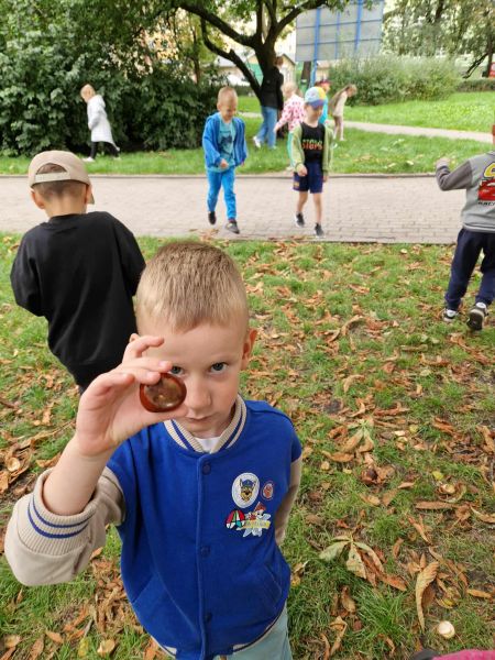 W dzisiejszym dniu dzieci z grupy Motyle wybrały się na poszukiwanie jesieni. Pierwsze oznaki dostrzegły zaraz po wyjściu z przedszkola. Liście, które zaczęły już zmieniać swoje barwy, owoce jarzębiny, kasztany, grzyby… Przedszkolaki z chęcią wskazywały charakterystyczne zmiany w przyrodzie. Do przedszkola wróciły z kasztanami, które samodzielnie nazbierały. Kasztany trafiły do jesiennego kącika przyrody.