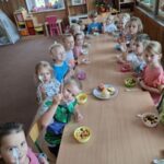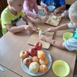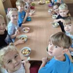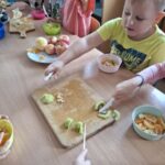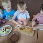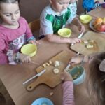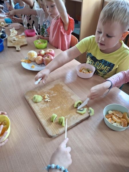 W środę 1 października Kubusie kolejny dzień poszerzały wiadomości na temat owoców, tego dnia nie brakowało różnych zabaw i ciekawych zajęć, jednak najbardziej spodobało się przedszkolakom własnoręczne przygotowanie sałatki owocowej. Przed przystąpieniem do pracy dzieci rozpoznawały owoce za pomocą dotyku. Następnie wszyscy udali sie do łazienki, aby dokladnie umyć ręce. Po ustaleniu zasad bezpieczeństwa dzieci przystąpiły do pracy. Przygotowanie sałatki sprawiło Kubusiom ogromną radość jednocześnie uświadamiając jak ważne jest spożywanie owoców, które zawierają mnóstwo witamin.