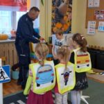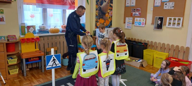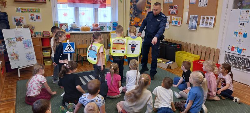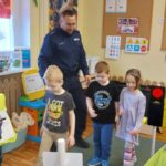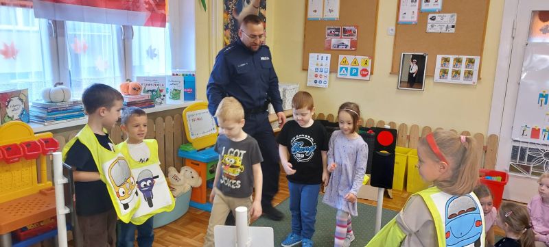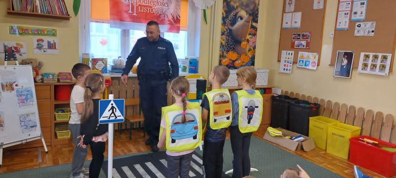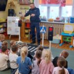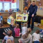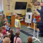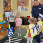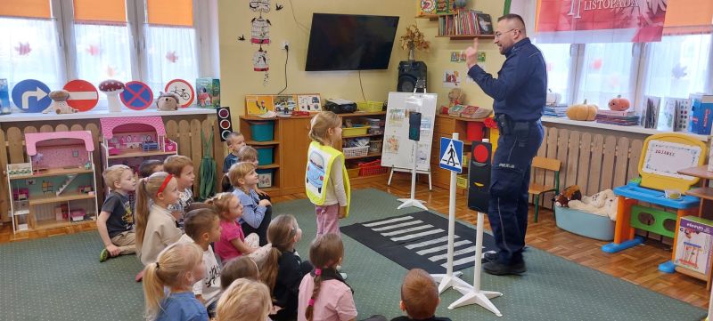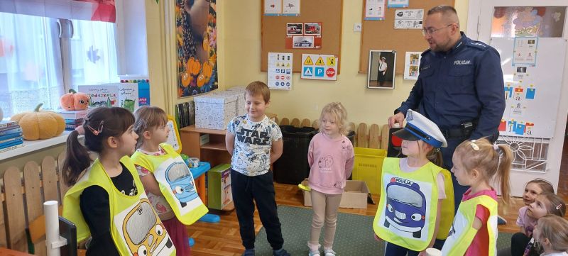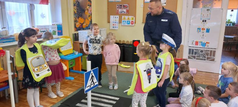 W dniu 6 listopada 2025 r. W naszym przedszkolu odbyło się spotkanie edukacyjno-profilaktyczne z funkcjonariuszem Policji w Grudziądzu, asp. Tomaszem Matuszakiem. Podczas zajęć dzieci poznały zasady bezpiecznego poruszania się po drodze, utrwaliły znajomość wybranych znaków drogowych oraz sygnalizacji świetlnej. W trakcie wspólnej zabawy przedszkolaki mogły wykorzystać zdobyte wiadomości w praktyce. Na zakończenie spotkania każde dziecko miało zrobione pamiątkowe zdjęcie z naszym gościem.