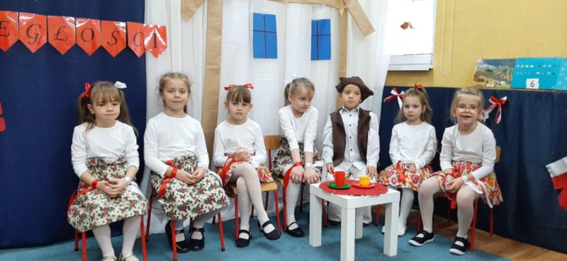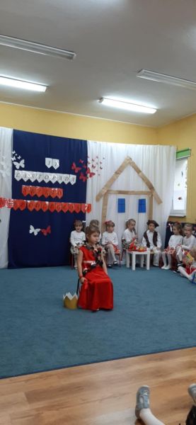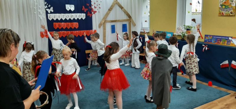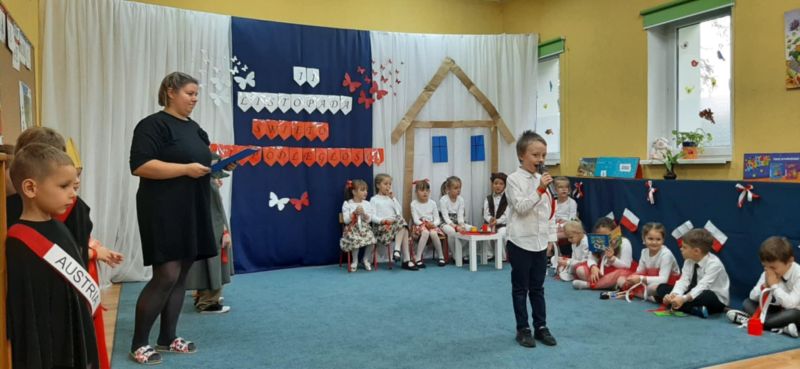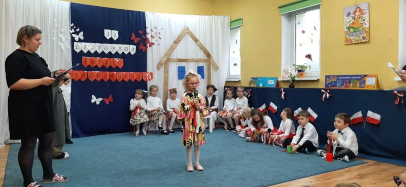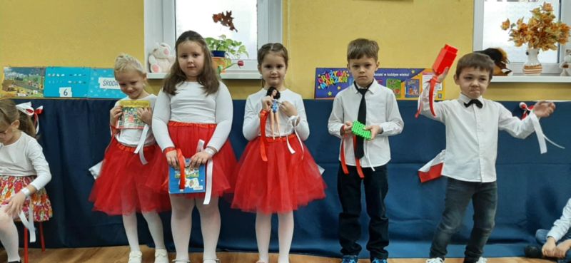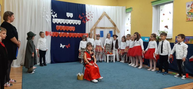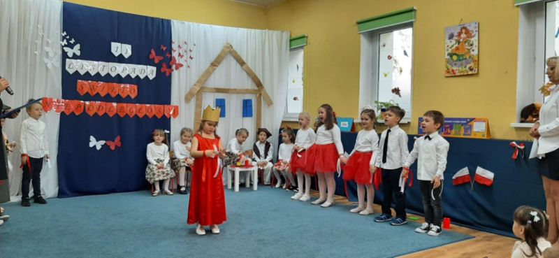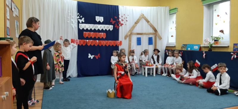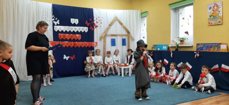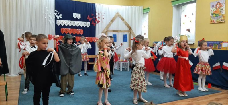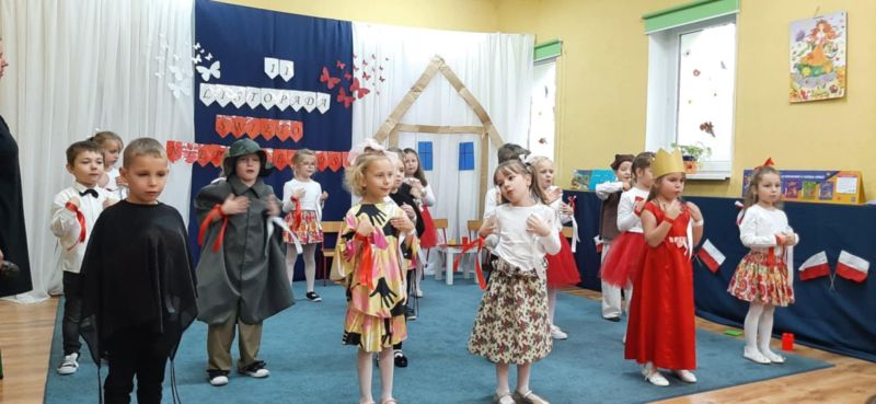 Dnia 6.11.2024. w naszym przedszkolu odbyła się uroczystość z okazji Święta Niepodległości. Historię naszej ojczyzny przybliżyła nam grupa „Motyli”, a całe przedstawienie zakończyło się uroczystym odśpiewaniem hymnu narodowego przez wszystkich przedszkolaków.