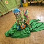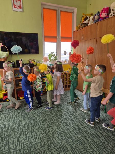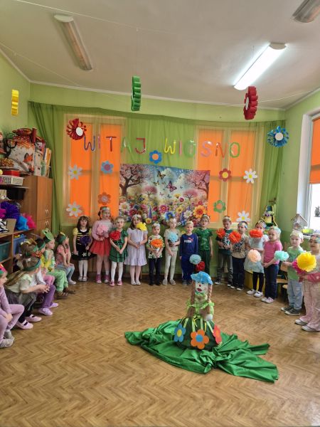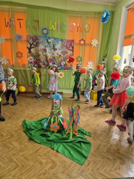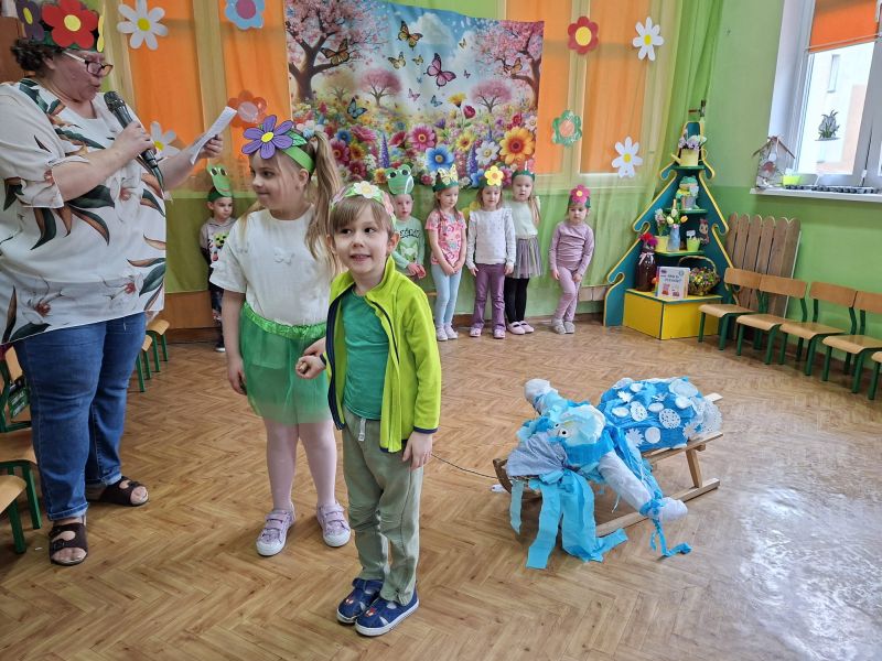i ,, wysłały” do krainy lodu i wiecznego chłodu wspólnie wołając:  Żegnaj Marzanno ty zimowa panno! Wiosnę dzieci przywołały wierszami i piosenkami. Każda grupa pięknie zaprezentowała krótki program słowno- muzyczny, aż w końcu przyszła do nas Pani Wiosna uśmiechnięta i radosna. Zaprosiła wszystkie dzieci do wspólnych zabaw, rozwiązywania wiosennych zagadek i zabaw muzyczno-ruchowych. W nagrodę za wspólną zabawę Pani Wiosna przygotowała dla każdej grupy kosz z niespodziankami, po który dzieci musiały przejść ścieżką kwiatowych emocji, które towarzyszyły dzieciom przez całą uroczystość.