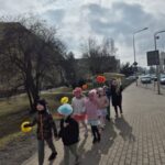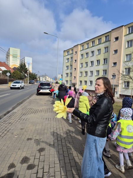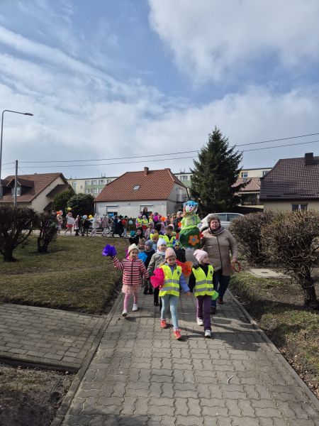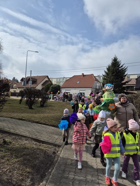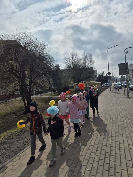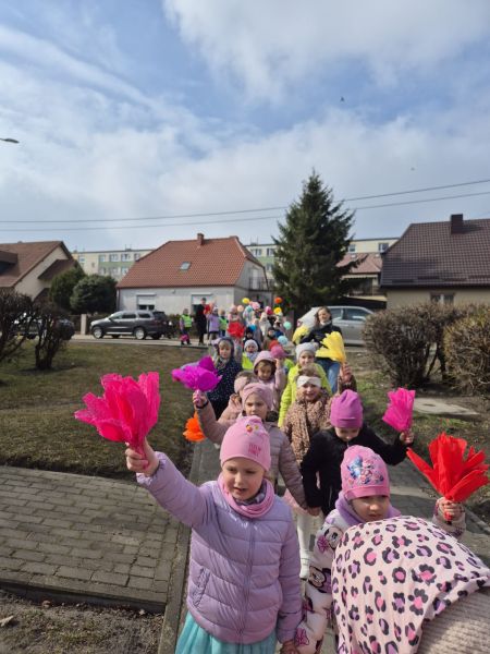 Aby uroczyście zakończyć naszą uroczystość Powitania Wiosny wszystkie przedszkolaki przemaszerowały w pobliżu przedszkola w kolorowym i barwnym korowodzie z kolorowymi kwiatami, gaikiem i Panią Wiosną wyrażając w ten sposób radość z przyjścia nowej pory roku.