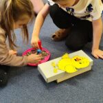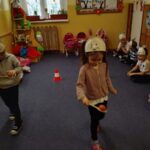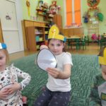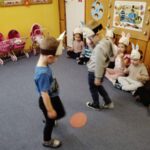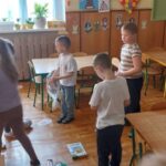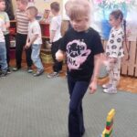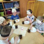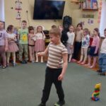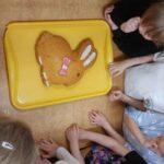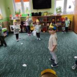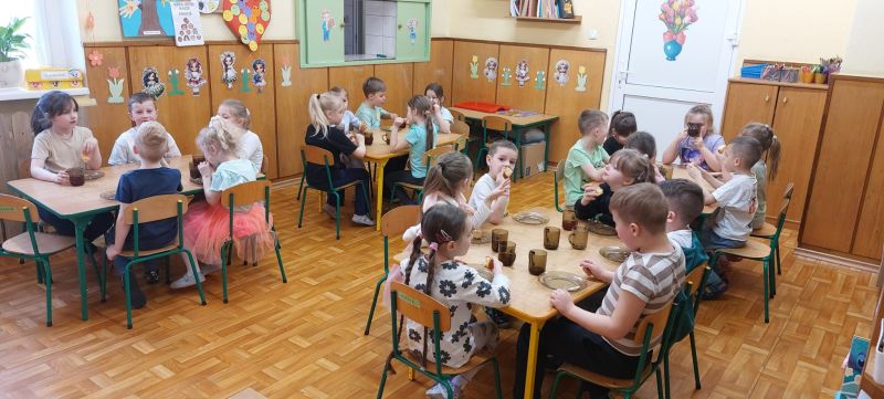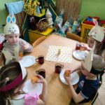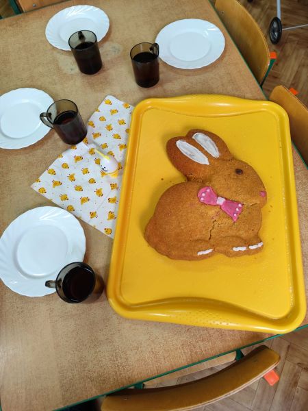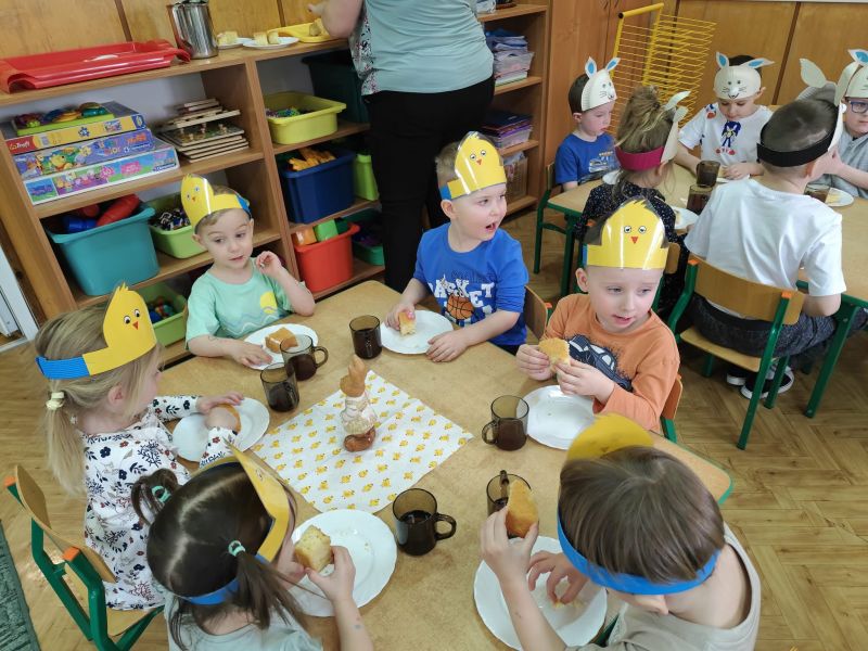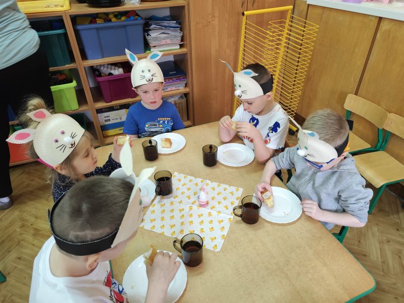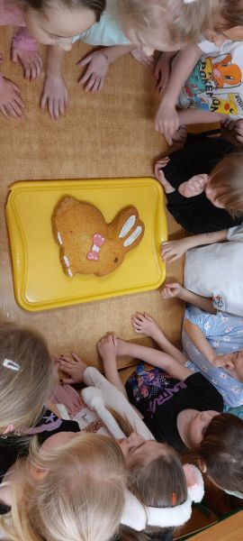Dnia 1 kwietnia 2026 r. dzieci z grupy „Jeżyki” świętowały „Zajączka”. Główną atrakcją było tropienie śladów, które doprowadziło przedszkolaki do wspaniałych upominków. Oprócz poszukiwań, dzieci brały udział w tematycznych zabawach: układały wielkanocne memo, rywalizowały w biegu z jajkiem oraz rozwijały talenty plastyczne. Na koniec wszyscy ze smakiem zjedli ciasto-zająca, upieczone specjalnie na tę okazję przez Panie kucharki. Zabawa była wyśmienita!