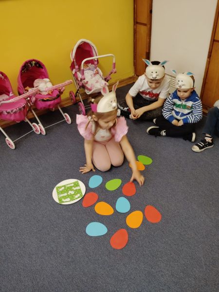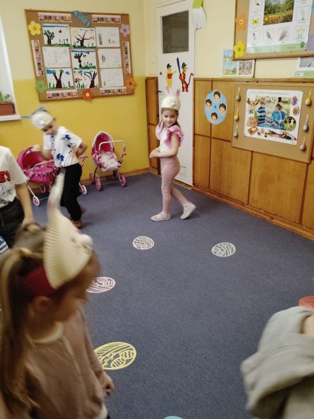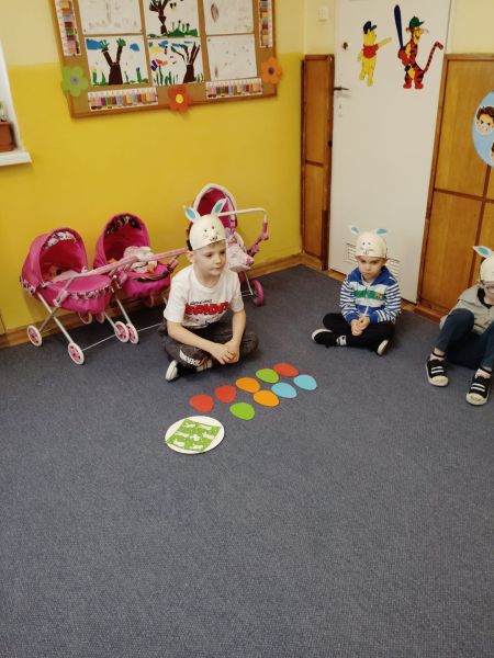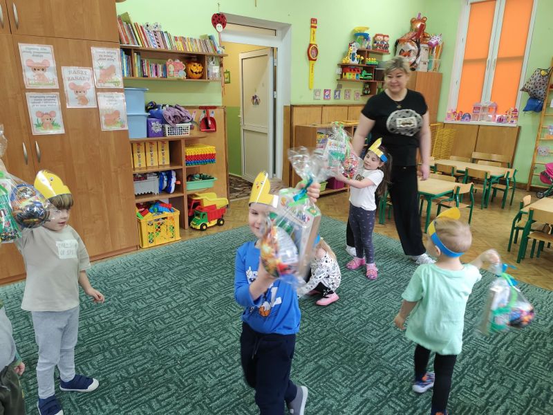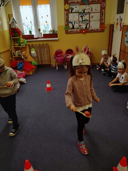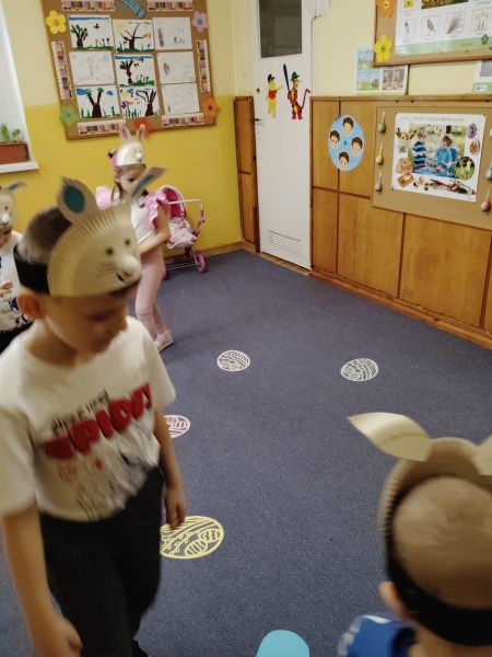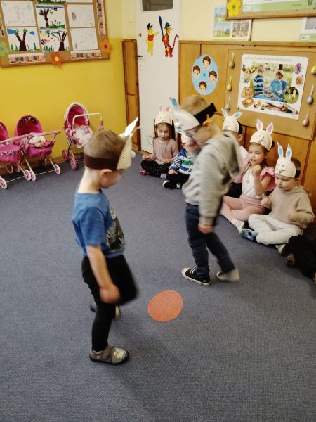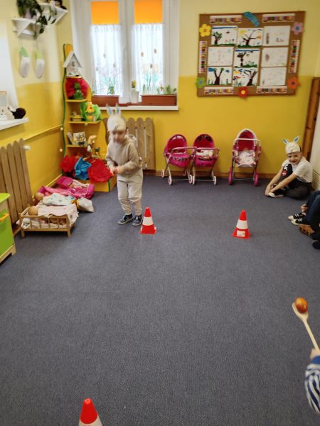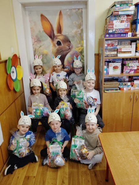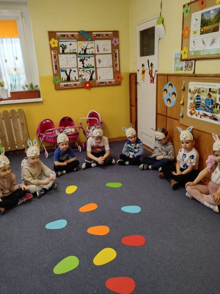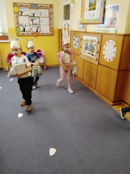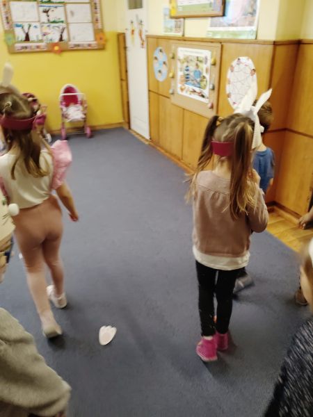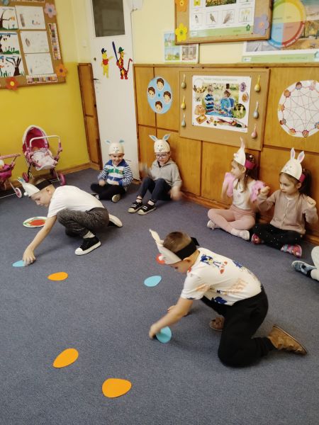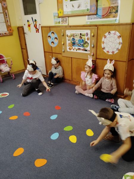 Zajączek w przedszkolu to radosna tradycja wielkanocna podczas której dzieci z grupy ,,Żabek” wykonywały różne zajączkowe zadania, które poprzedziły szukanie ukrytych w sali upominków. Dzieci rozwiązywały zagadki o tematyce wiosennej i świątecznej, które znajdowały się na kolorowych pisankach, wykonywały zadania sprawnościowe, śpiewały piosenki o zajączku i ilustrowały je ruchem. Był to dzień pełen emocji i wrażeń oraz zadań i niespodzianek, który wprowadził przedszkolaki w świąteczny nastrój.