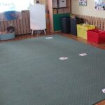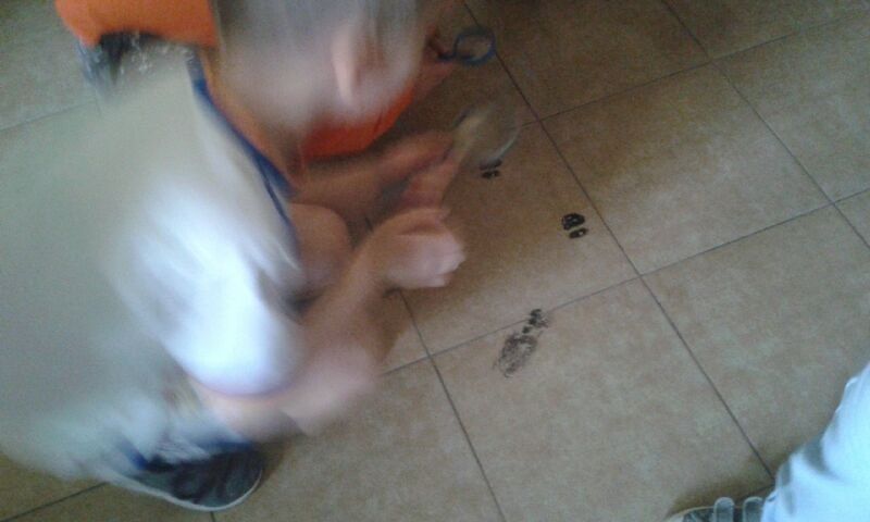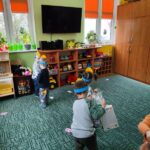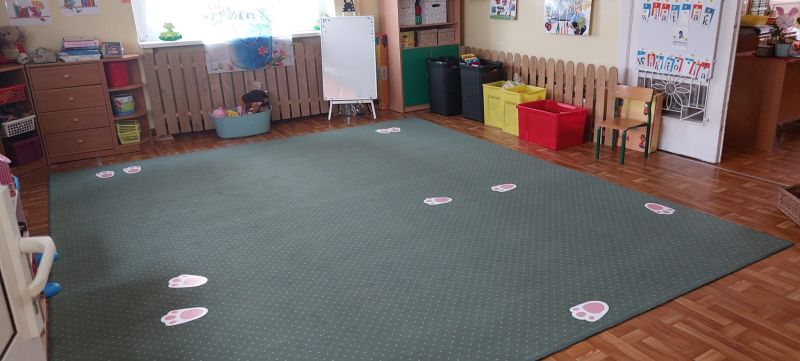 Zajączek, który dziś niezauważony przykicał do naszego przedszkola zostawiła w całym budynku ślady. Po tych śladach i wykonaniu różnych zadań dzieci dotarły do pozostawionych przez naszego gościa koszyczków z niespodziankami.