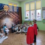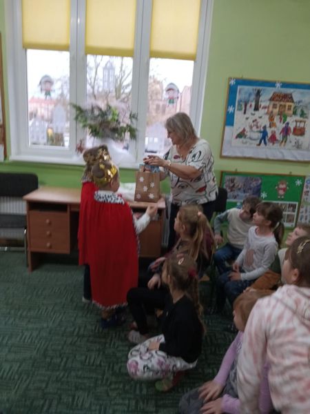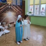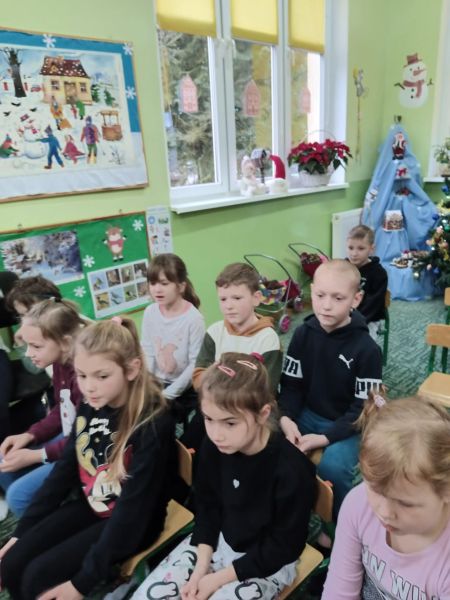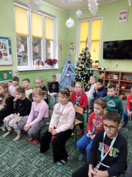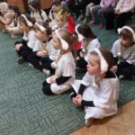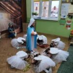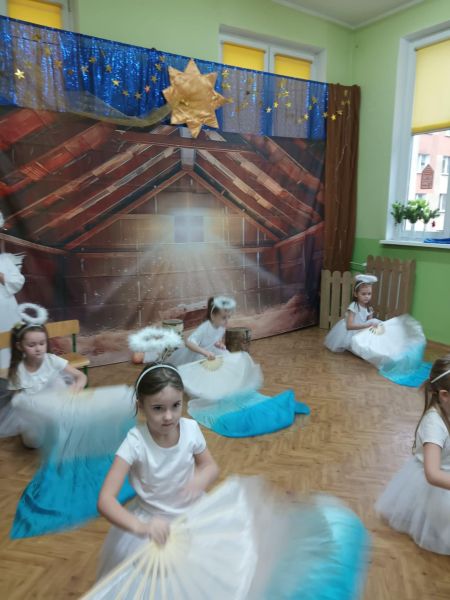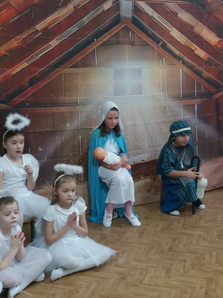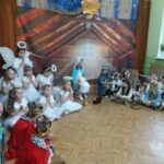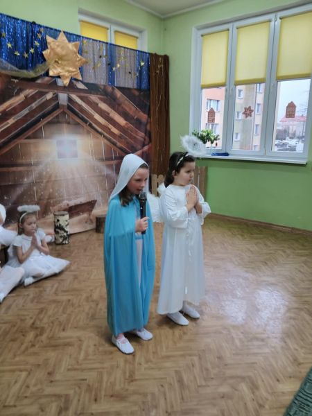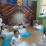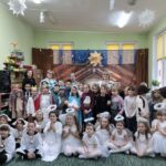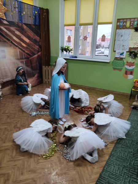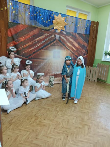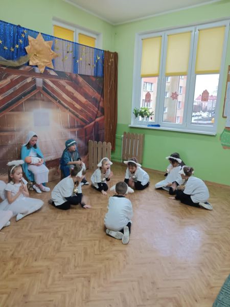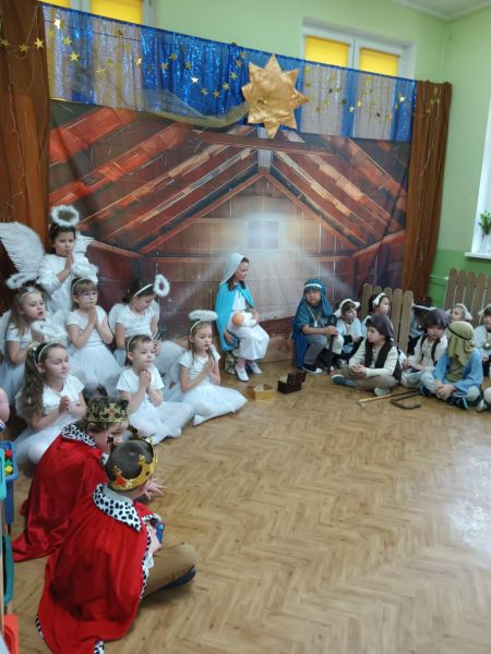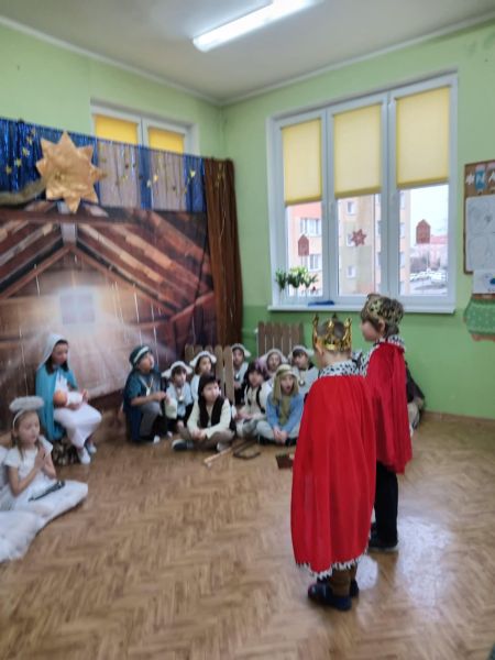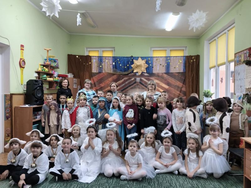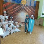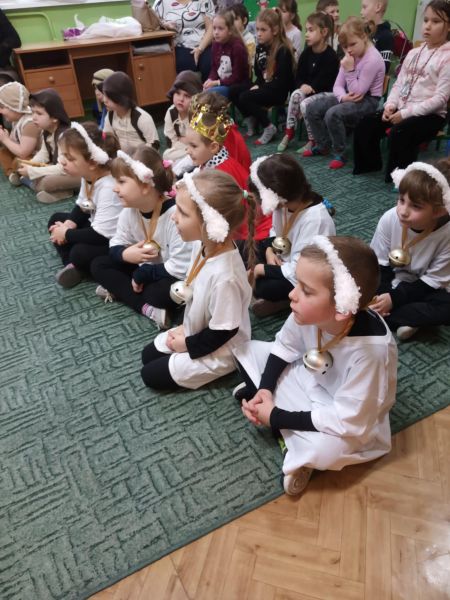 Tradycją naszego przedszkola jest, że w okolicy Bożego Narodzenia zapraszamy dzieci z zaprzyjaźnionej z kl. I B ze SP Nr 15 na wspólne kolędowanie. Wszak Boże Narodzenie jest po to, by dzielić się radością z innym. Betlejemska scenografia, blask światełek i świec, magia kolęd wprowadziły wszystkich w świąteczny i radosny nastrój. Za sprawą naszych „Małych Kolędników” czyli JEŻYKÓW, przenieśliśmy się do Betlejem. Całość przedstawienia pokazywała scenki z życia nowo narodzonego dzieciątka, pasterzy, królów i aniołów przeplatana była pięknymi pastorałkami.