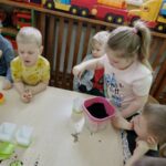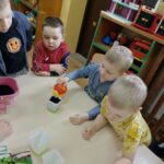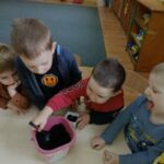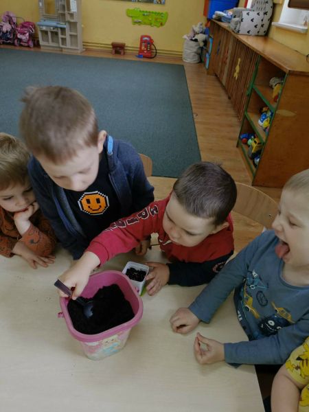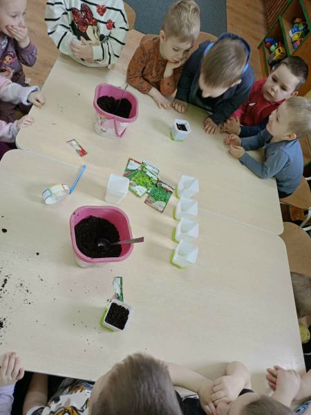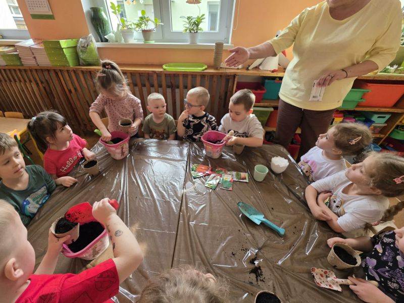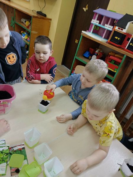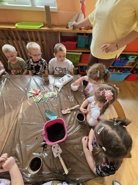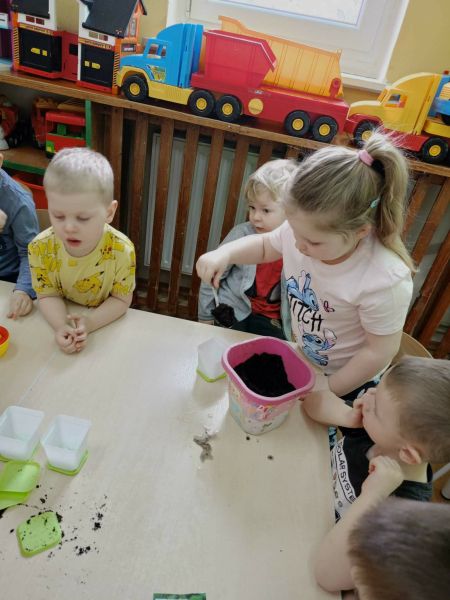 Dzieci z grupy Kurczaków również zamieniły się w ogrodników i wspólnie z paniami zasiały nasiona (koperek, pietruszkę, rzodkiewkę, szczypiorek, rukolę i bazylię). Każdy przedszkolak cierpliwie czekał na swoją kolej i uważnie słuchał poleceń pań. Mali ogrodnicy dowiedzieli się jak dbać o rośliny oraz czego potrzebują, by urosły. Podczas wspólnej pracy panowała radosna atmosfera a dzieci były zadowolone, że mogły same zasiać nasiona.