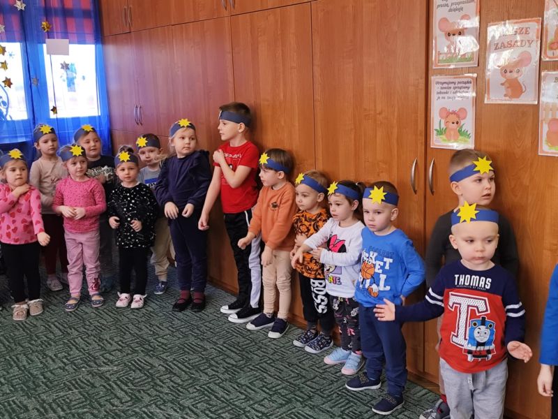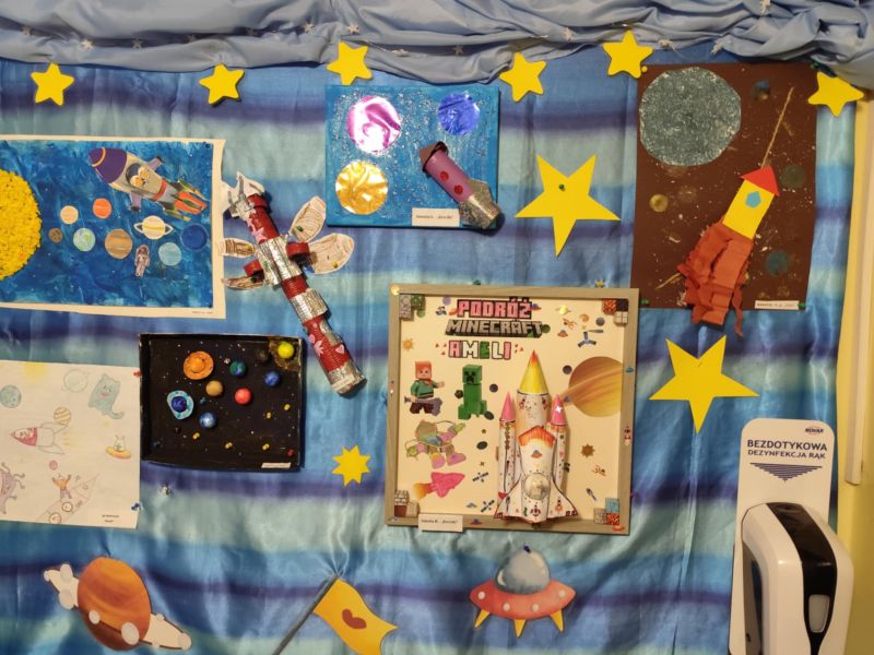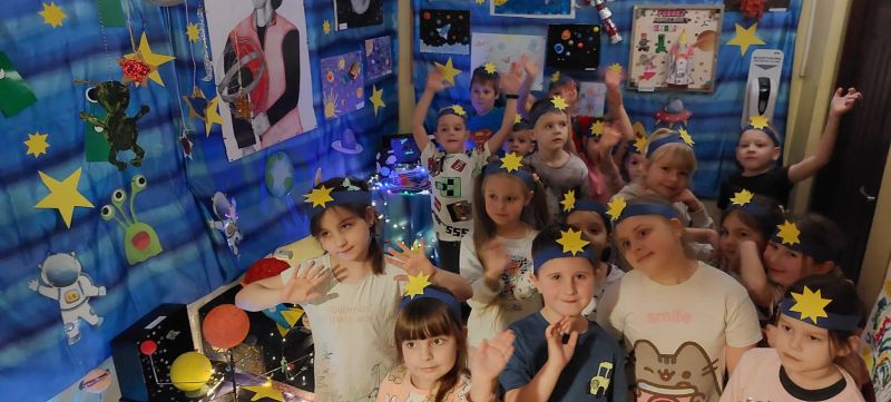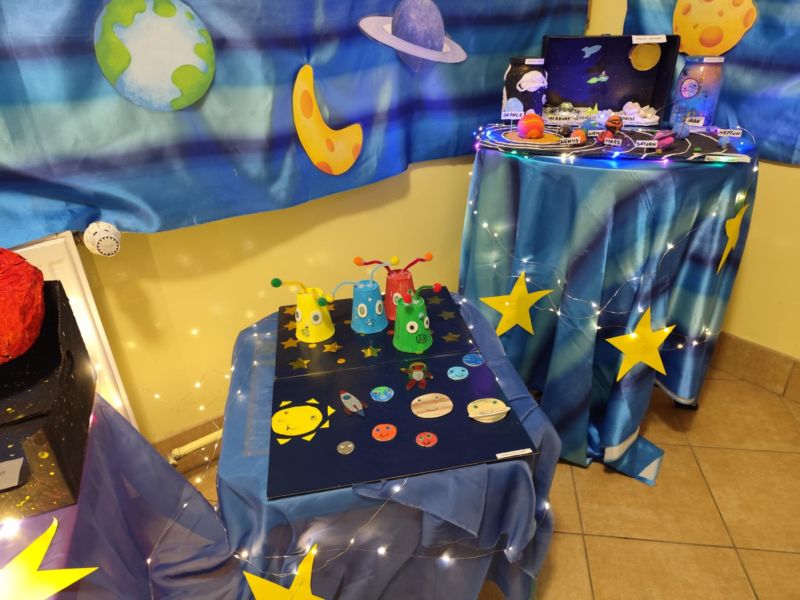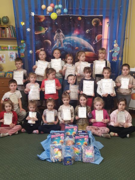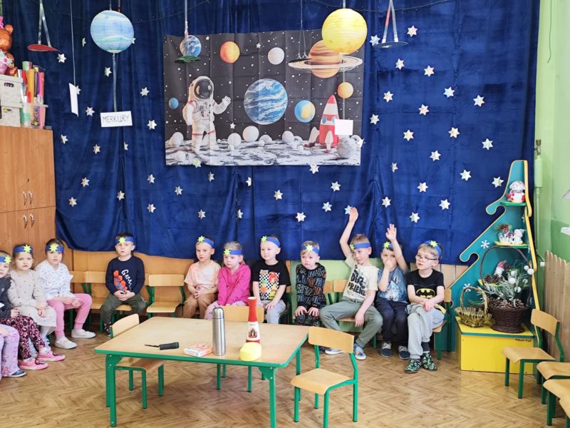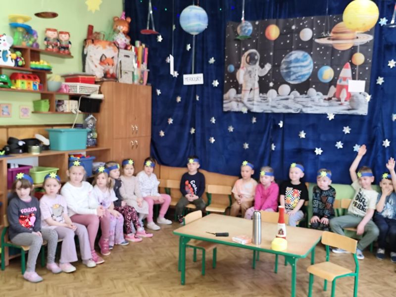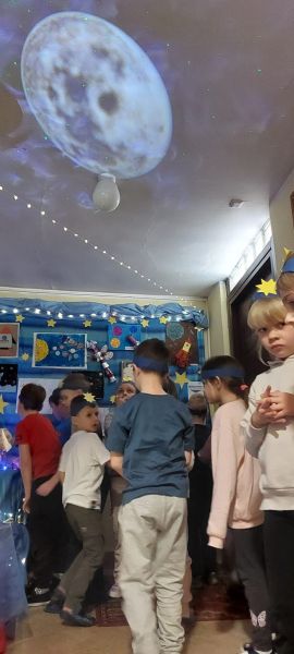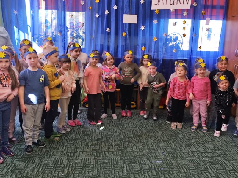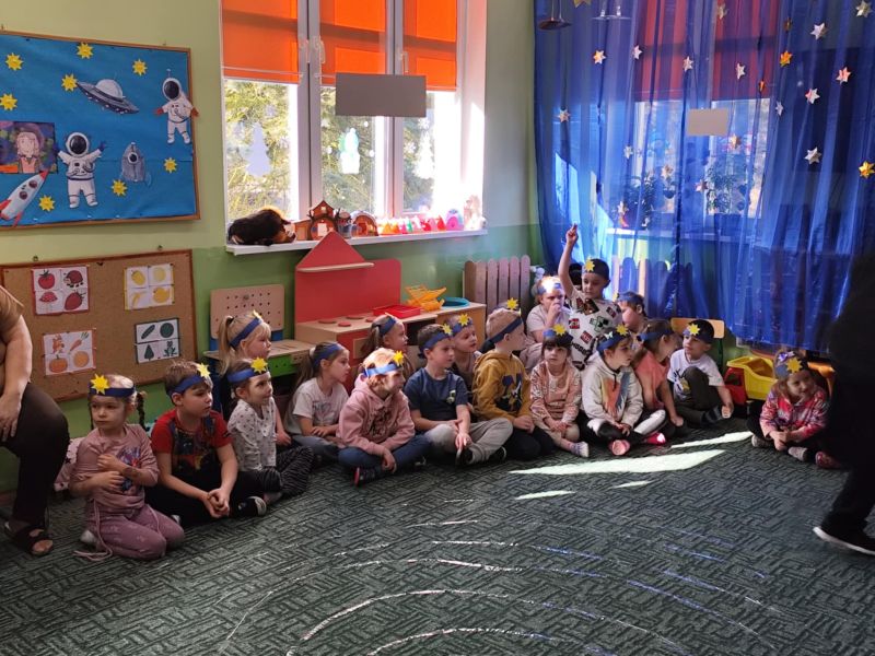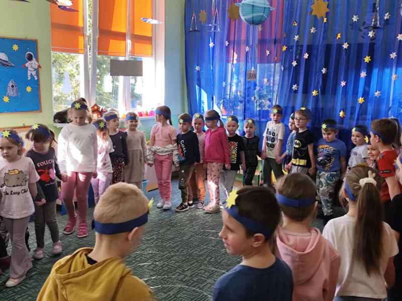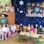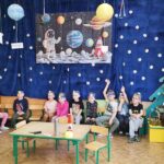 W naszym przedszkolu uroczystość pt. „Zabawy w kosmosie” rozpoczęła się od… pakowania plecaka. Znalazły się w nim m.in.: latarka, bidon, telefon, gry, pluszak… I zaczęła się na niby wyprawa w kosmos… Dzieci załoźyły kosmiczne kombinezony, z gr. JEŹYKI zostało wybrane dowództwo statku kosmicznego, któremu imię-KOPERNIK 2026-nadała Pani Dyrektor, a po uroczystym pożegnaniu statek ruszył w kosmos. Uczestnicy wyprawy poznawali i utrwalali wiadomości nt. planet układu słonecznego, naśladowali ich ruch po orbitach wokół słońca, odkrywszy obecność 'obcego’ na pokładzie, nauczyły go rozpoznawania emocji i uczyć. Zgrabnie omijając deszcz tęczowych meteorytów, wróciły na Ziemię. Na zakończenie uczestnicy wyprawy brawurowo odpowiadali na pytania w krótkim quizie wiedzy o kosmosie. Zwieńczeniem przygody okazał się prezent od obcego-chrupki w kształcie gwiazdek.