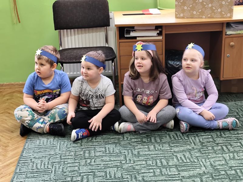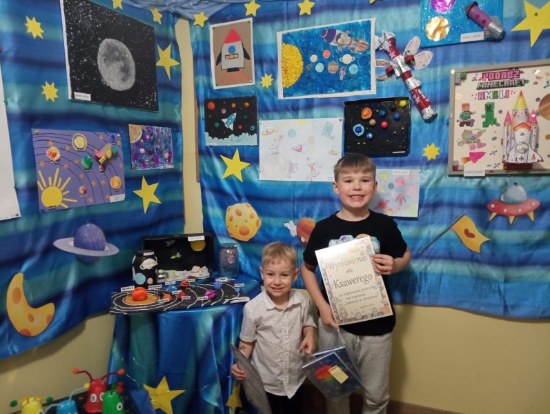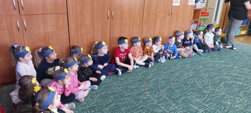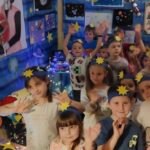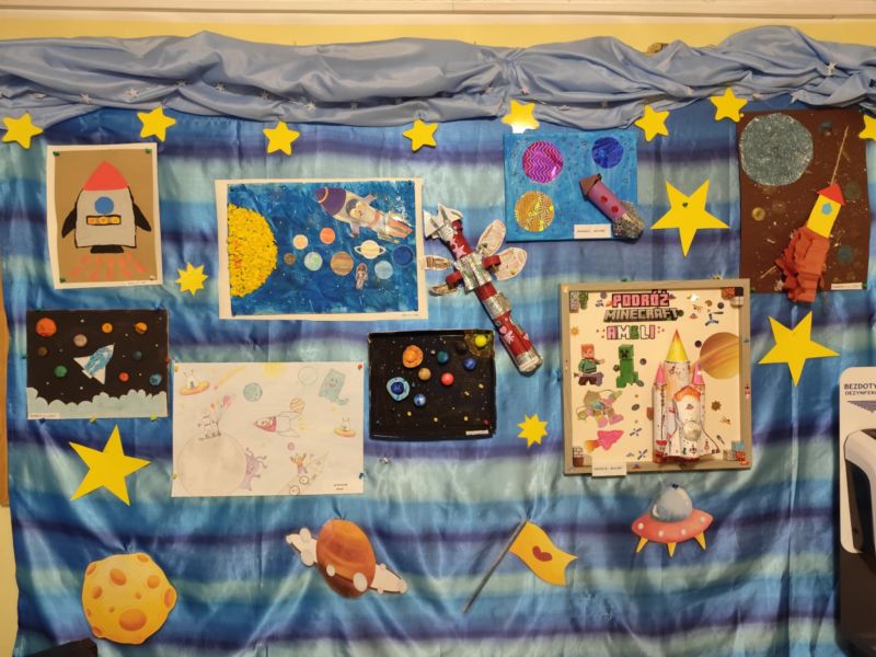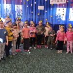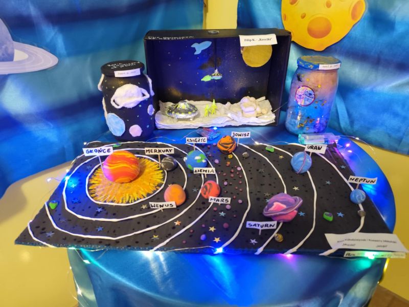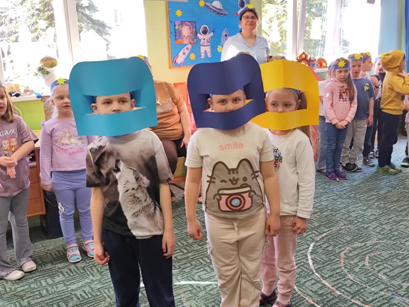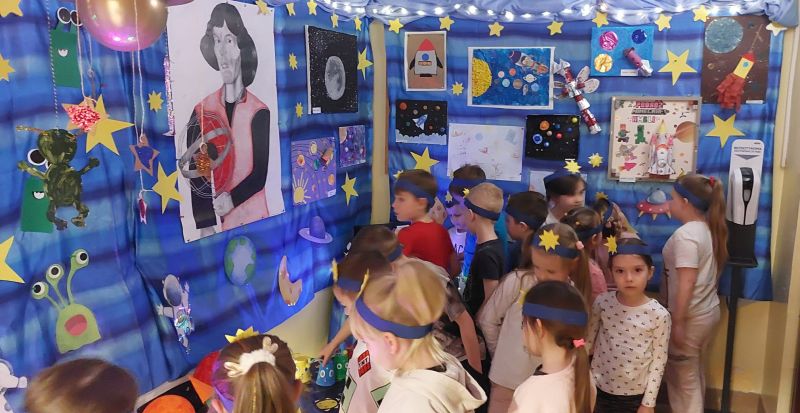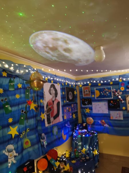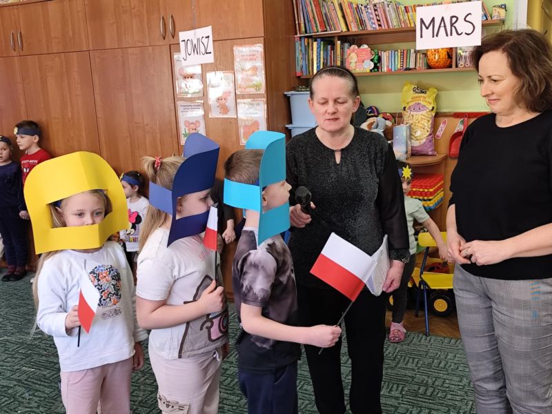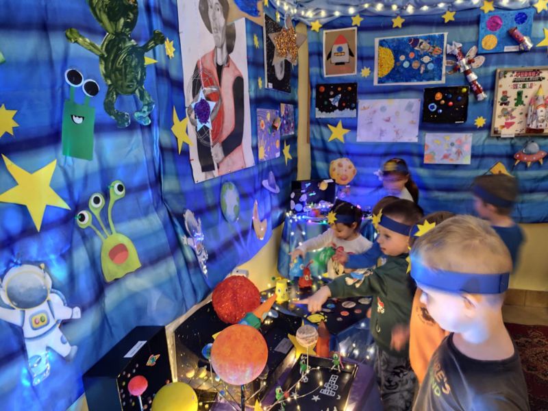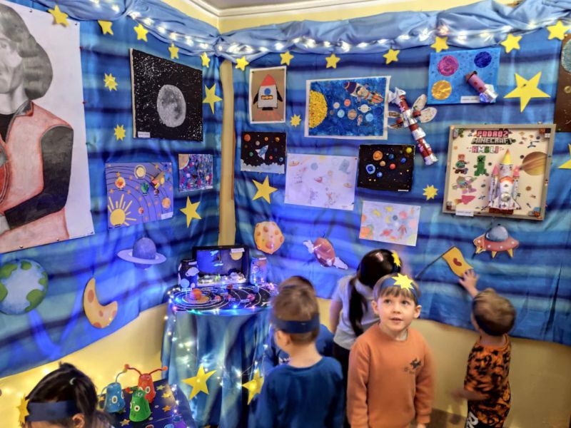 W naszym przedszkolu uroczystość pt. „Zabawy w kosmosie” rozpoczęła się od… pakowania plecaka. Znalazły się w nim m.in.: latarka, bidon, telefon, gry, pluszak… I zaczęła się na niby wyprawa w kosmos… Dzieci załoźyły kosmiczne kombinezony, z gr. JEŹYKI zostało wybrane dowództwo statku kosmicznego, któremu imię-KOPERNIK 2026-nadała Pani Dyrektor, a po uroczystym pożegnaniu statek ruszył w kosmos. Uczestnicy wyprawy poznawali i utrwalali wiadomości nt. planet układu słonecznego, naśladowali ich ruch po orbitach wokół słońca, odkrywszy obecność 'obcego’ na pokładzie, nauczyły go rozpoznawania emocji i uczyć. Zgrabnie omijając deszcz tęczowych meteorytów, wróciły na Ziemię. Na zakończenie uczestnicy wyprawy brawurowo odpowiadali na pytania w krótkim quizie wiedzy o kosmosie. Zwieńczeniem przygody okazał się prezent od obcego-chrupki w kształcie gwiazdek.
